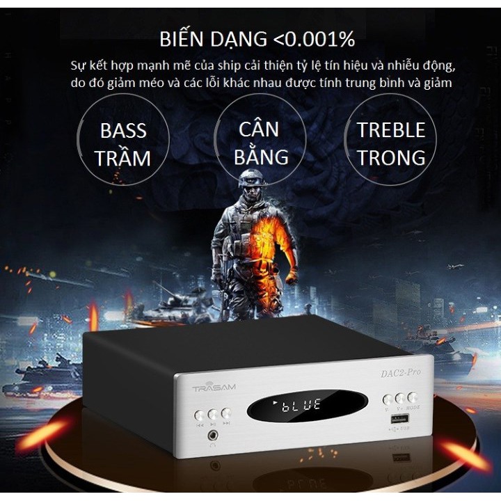 BỘ DAC GIẢI MÃ KHUẾCH ĐẠI ÂM THANH BLUETOOTH 32BIT 192KHZ TRASAM DAC2 PRO - DAC NGHE NHẠC DSD BLUETOOTH 2020NỐI TIẾP SỰ THÀNH CÔNG CỦA PHIÊN BẢN DAC 2 PLUS, ĐẦU NĂM 2019 HÃNG TRASAM ĐÃ GIỚI THIỆU PHIÊN BẢN MỚI TRASAM DAC 2 PRO VỚI NHIỀU CẢI TIẾN MANG TÍNH ĐỘT PHÁ. ĐÁNG CHÚ Ý NHẤT ĐÓ LÀ HÃNG ĐÃ NÂNG CẤP LÊN CHIP GIẢI MÃ SA9926 HỖ TRỢ NHẠC DSD64, 9018K2M HỖ TRỢ NHẠC 32BIT/192KHZ ĐỒNG THỜI NÂNG CẤP BLUETOOTH LÊN CHUẨN 4.2 BIẾN DAC 2 PRO THÀNH DAC NGHE NHẠC LOSSLESS BLUETOOTH CHẤT LƯỢNG CAO, HỖ TRỢ ĐẦY ĐỦ CÁC KẾT NỐI KỸ THUẬT SỐ ĐẦU VÀO DIGITAL COXIAL, USB, OPTICAL.