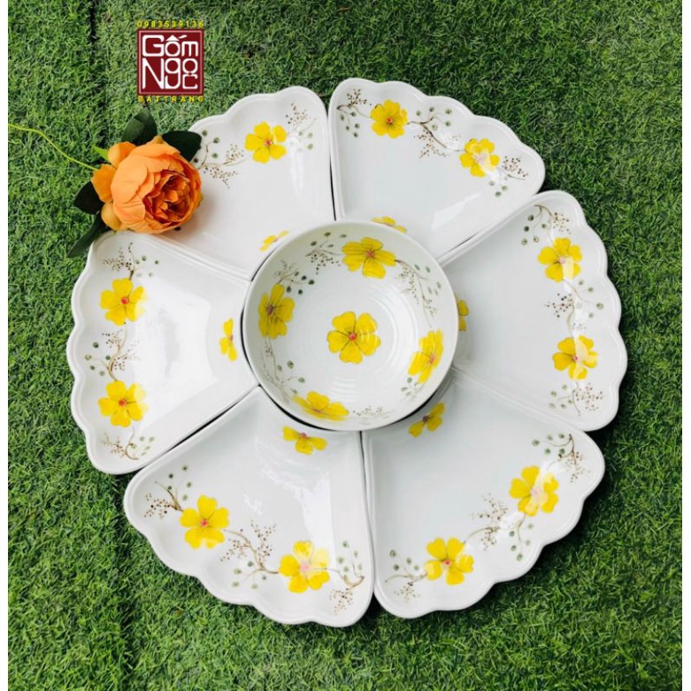 BỘ ĐỒ ĂN HOA MẶT TRỜI, BÁT ĐĨA, TÔ, CHÉN, ẤM, LỌ HOA GỐM SỨ BÁT TRÀNG CAO CẤP