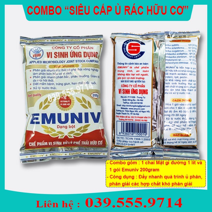 BỘ ĐÔI 01 TÚI CHẾ PHẨM Ủ RÁC VÀ PHÂN BÓN EMUNIV 200GRAM VÀ 01 CHAI MẬT RỈ ĐƯỜNG LOẠI 1 LÍT