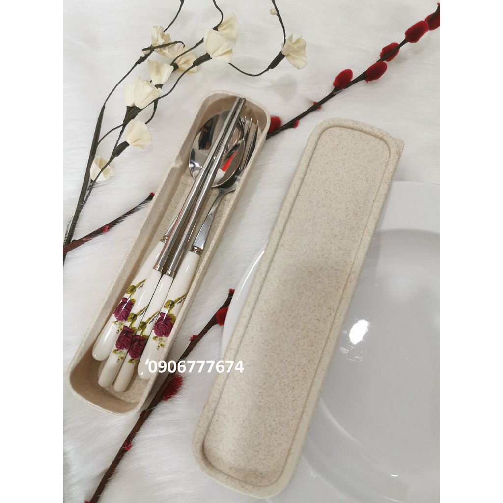 - Bộ sản phẩm gồm 4 món: muỗng, đũa, nĩa và hộp đựng.