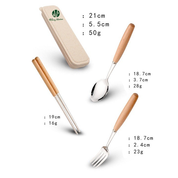 - Chất liệu: bộ đồ ăn inox cán gỗ sồi với hộp đựng bằng nhựa lúa mạch với các chi tiết: