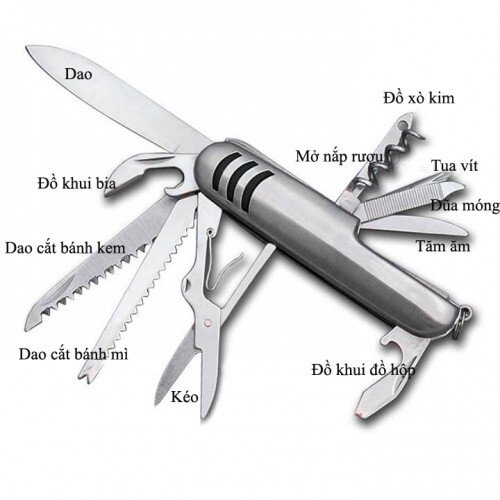 - Gồm có 11 chi tiết nhỏ, bộ dao đa năng có thể đáp ứng mọi nhu cầu sử dụng, sửa chữa của bạn: lưỡi dao cắt, kéo, tua vít, khui nắp chai, mở đồ hộp, dũa móng tay,… và các công dụng khác, tùy thuộc vào cách sử dụng của bạn. Các chi tiết được thiết kế thông minh, nhỏ gọn và có thể gập vào khi không sử dụng. Dao đa năng 11 món là sản phẩm vô cùng tiện dụng trong những chuyến đi chơi xa, du lịch, picnic. Shopee.vn/grandstore