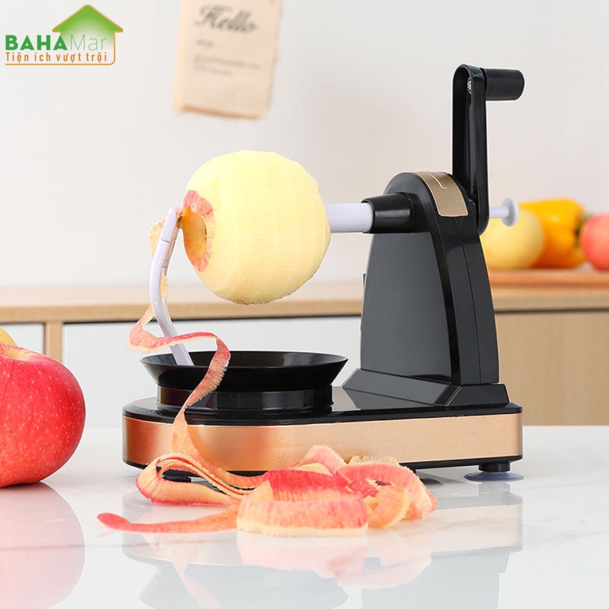 BỘ DỤNG CỤ GỌT - CẮT TRÁI CÂY TỰ ĐỘNG "BAHAMAR" Lưỡi dao quay cùng với trái cây, có thể nhanh chóng lột vỏ hoàn chỉnh, không lãng phí phần ruột