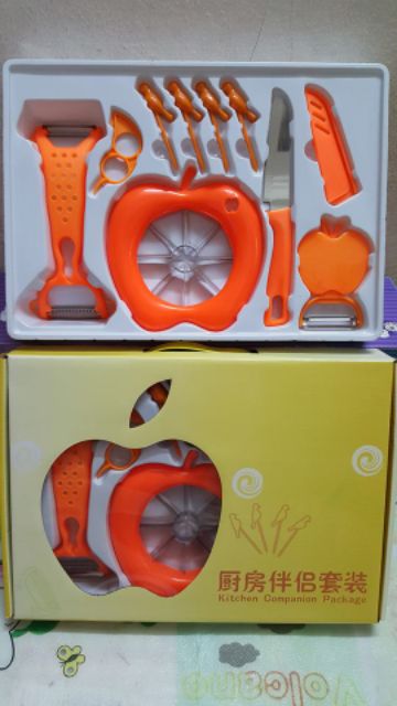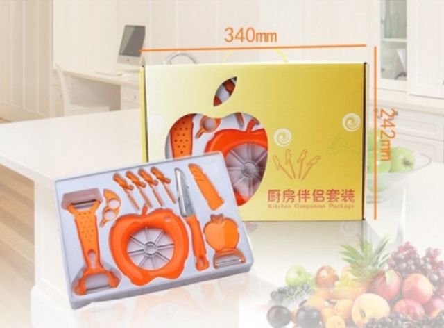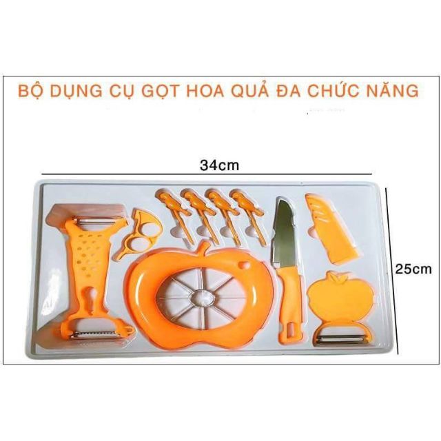 Bộ dụng cụ cắt gọt hoa quả 10 món là sản phẩm mới nhất hiện nay.Bộ dụng cụ cắt gọt hoa quả 10 món bao gồm các dụng cụ cắt gọt thiết thực trong gia đình bạn như dao,dụng cụ bào rau củ quả,dụng cụ bổ táo... giúp các bà nội trợ làm các món salad,rao trộn,bổ táo... một cách nhanh nhất. Bộ dụng cụ cắt gọt hoa quả 10 món1.Thông tin sản phẩm: - Tên sản phẩm :Bộ dụng cụ cắt gọt hoa quả đa năng 10 món. - Màu sắc: Cam - Chất liệu :Nhựa +Thép không gỉ. - Kích thước hộp đựng: 34x25 cm. - Bộ sản phẩm bao gồm: 10 món (1 dao, 1 dụng cụ nạo vỏ, 4 dụng cụ xiên hoa quả, 1 dụng cụ bóc vỏ cam,quýt, 1 dụng cụ xắt miếng , 1 vỏ dao , 1 Nạo thái sợi đa năng ). Bộ dụng cụ cắt gọt hoa quả 10 món