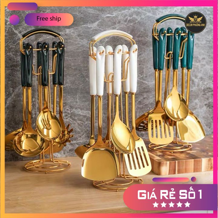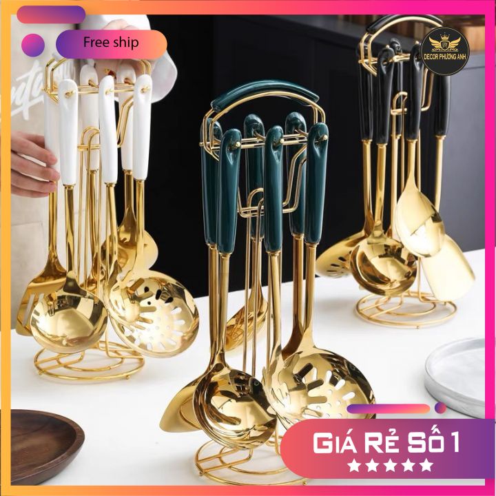 ❤️ 𝙁𝙍𝙀𝙀 𝙎𝙃𝙄𝙋 ❤️ Bộ dụng cụ muôi muỗng nhà Bếp 7 món cao cấp 304 k gỉ kèm giá treo tiện lợi