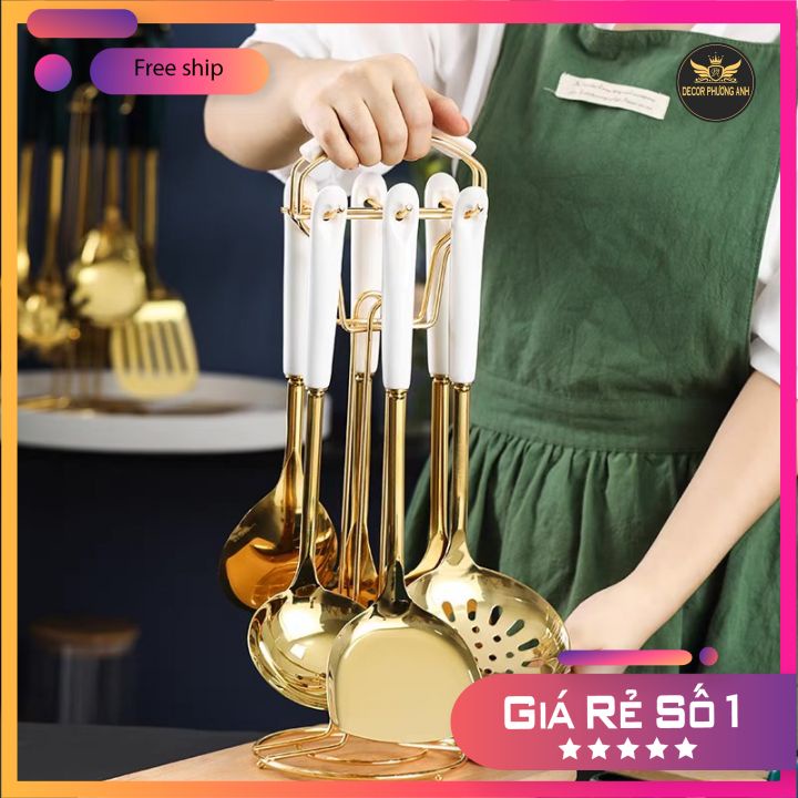 Giới thiệu ❤️ 𝙁𝙍𝙀𝙀 𝙎𝙃𝙄𝙋 ❤️ Bộ dụng cụ muôi muỗng nhà Bếp 7 món cao cấp 304 k gỉ kèm giá treo tiện lợi
