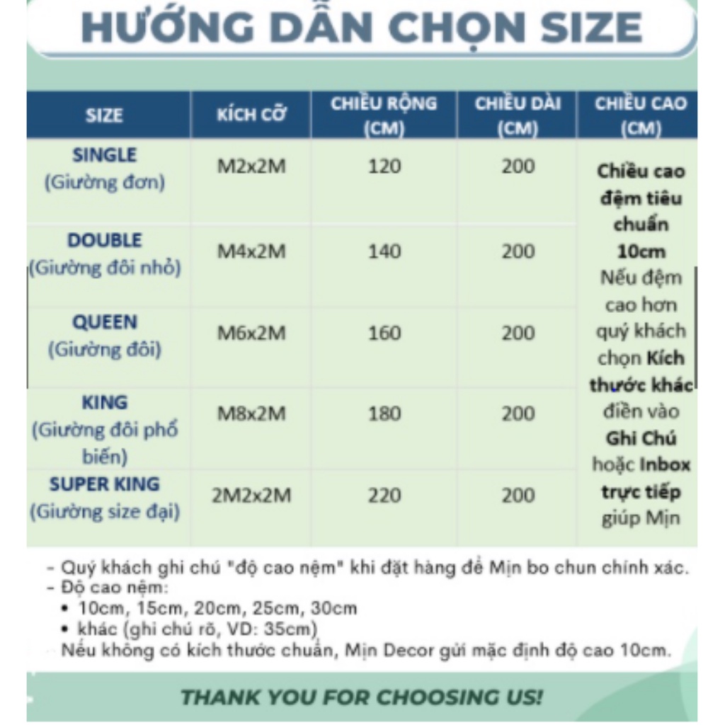 1 ga phủ như hình cho đủ các kích thước ( đã chần bông )