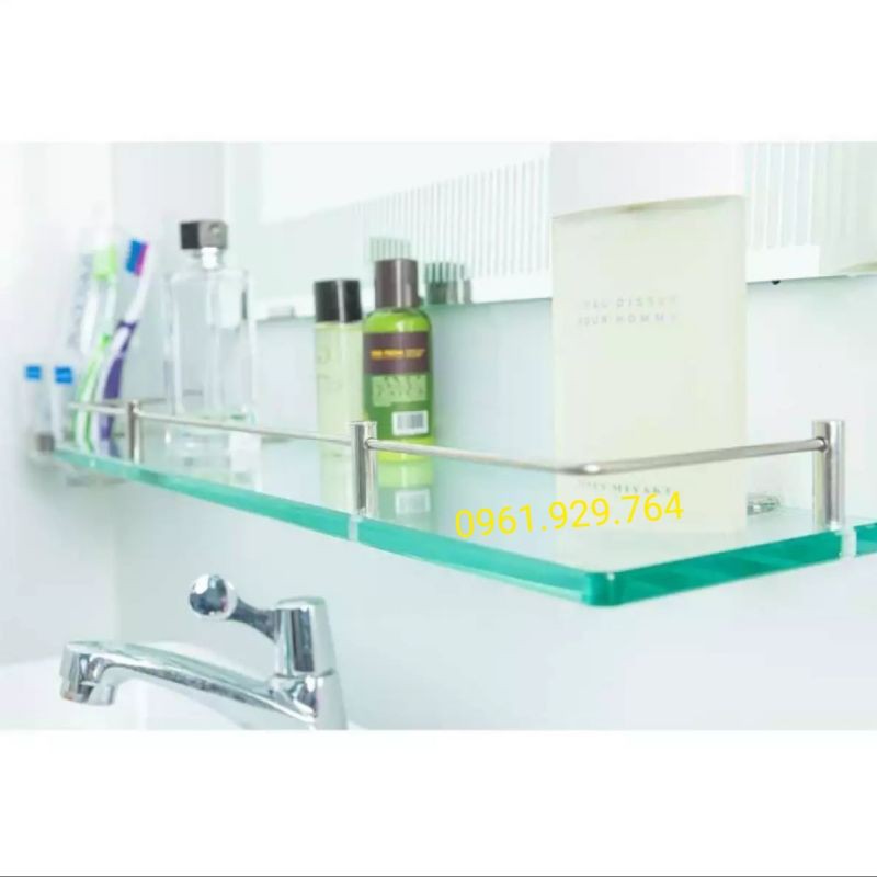 - Kệ gương có rào chắn và pas kệ loại lớn chất liệu Inox cao cấp. Kệ dầy, chắc chắn kích thước R12 x D 40 - 50 cm × dầy 1cm