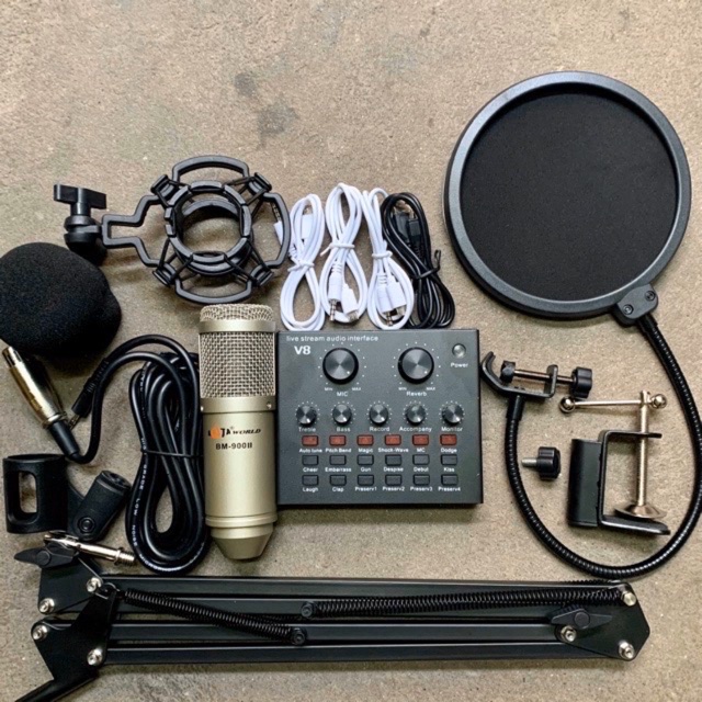 Thiết Bị Âm Thanh > Micro thu âm || Chọn Bộ Hát Thu Âm karaoke Micro AQATA BM900-Sound card V8 tiếng anh chân kẹp+màng lọcCòn hàng