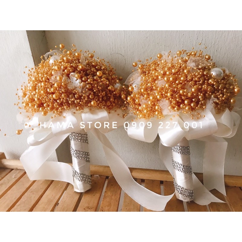 BÓ HOA CƯỚI CẦM TAY CÔ DÂU BẰNG HẠT TRAI KẾT HẠT CHÂU KẾT CƯỜM MÀU NÂU ĐIỂM HOA NHỰA MÀU KEM PHONG CÁCH CƯỚI HIỆN ĐẠI