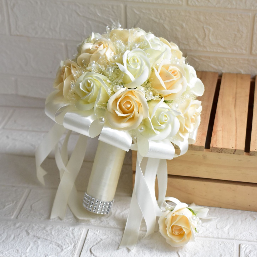 Nhà cửa & Đời sống > Trang trí nhà cửa > Hoa trang trí || Bó hoa cưới cầm tay cô dâu hoa hồng sáp trắng, cam pastel, kem. Tặng kèm hoa cài áo chú rể. Có lớn big sizeCòn hàng