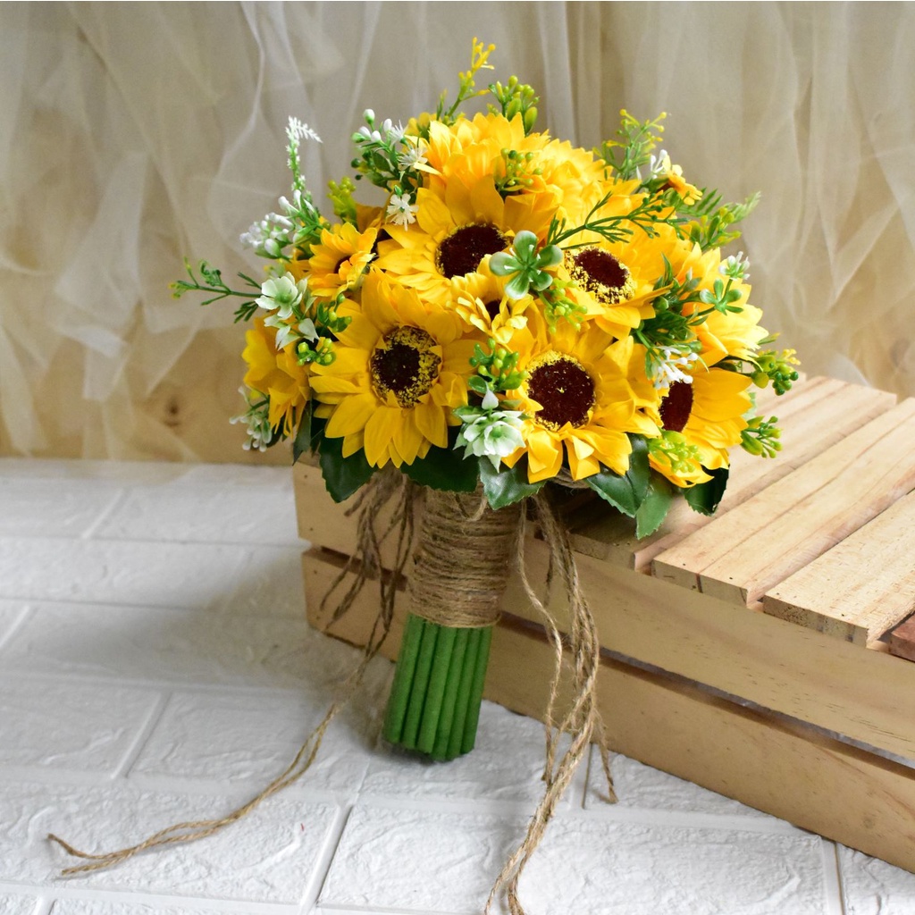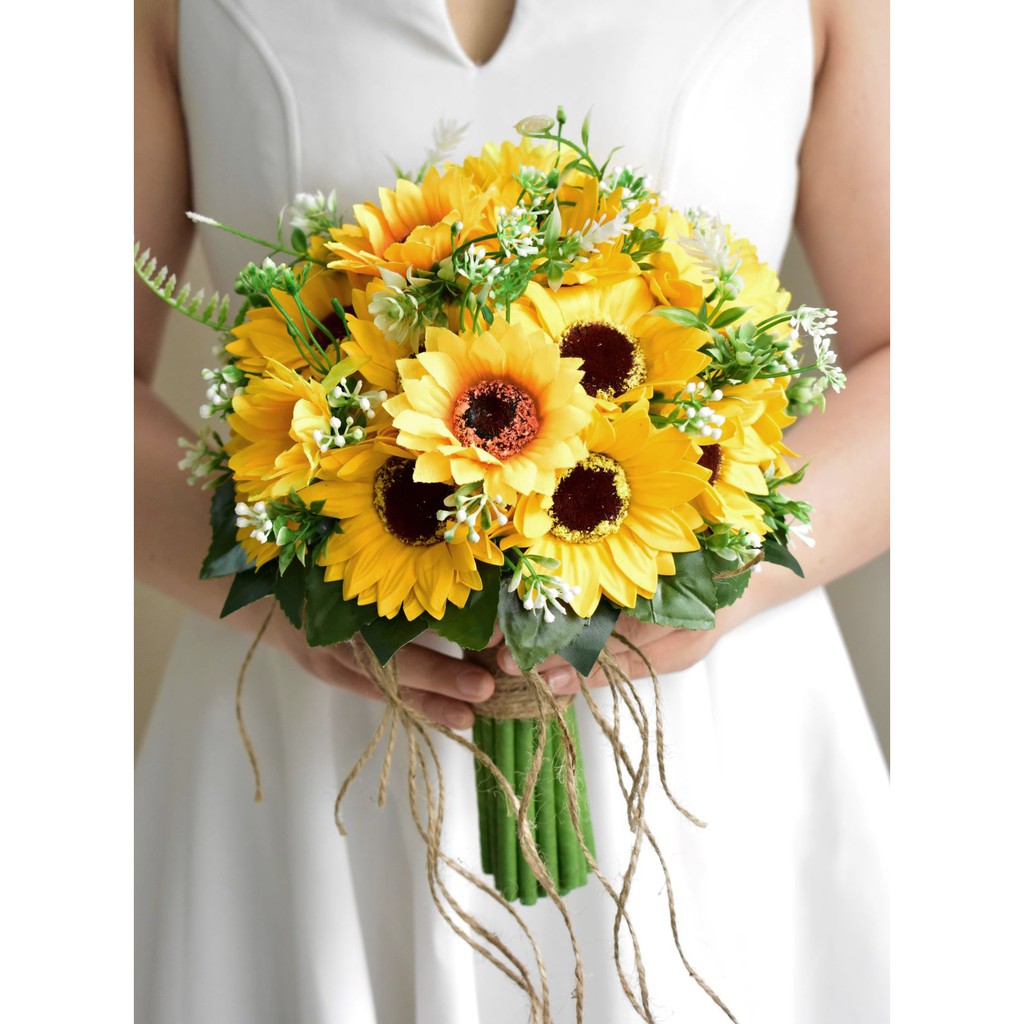 BÓ HOA CƯỚI CẦM TAY CÔ DÂU HOA HƯỚNG DƯƠNG SÁP VÀNG ĐIỂM HOA BABY NHỰACÓ TẶNG KÈM 1 CÀI ÁO CHÚ RỂ