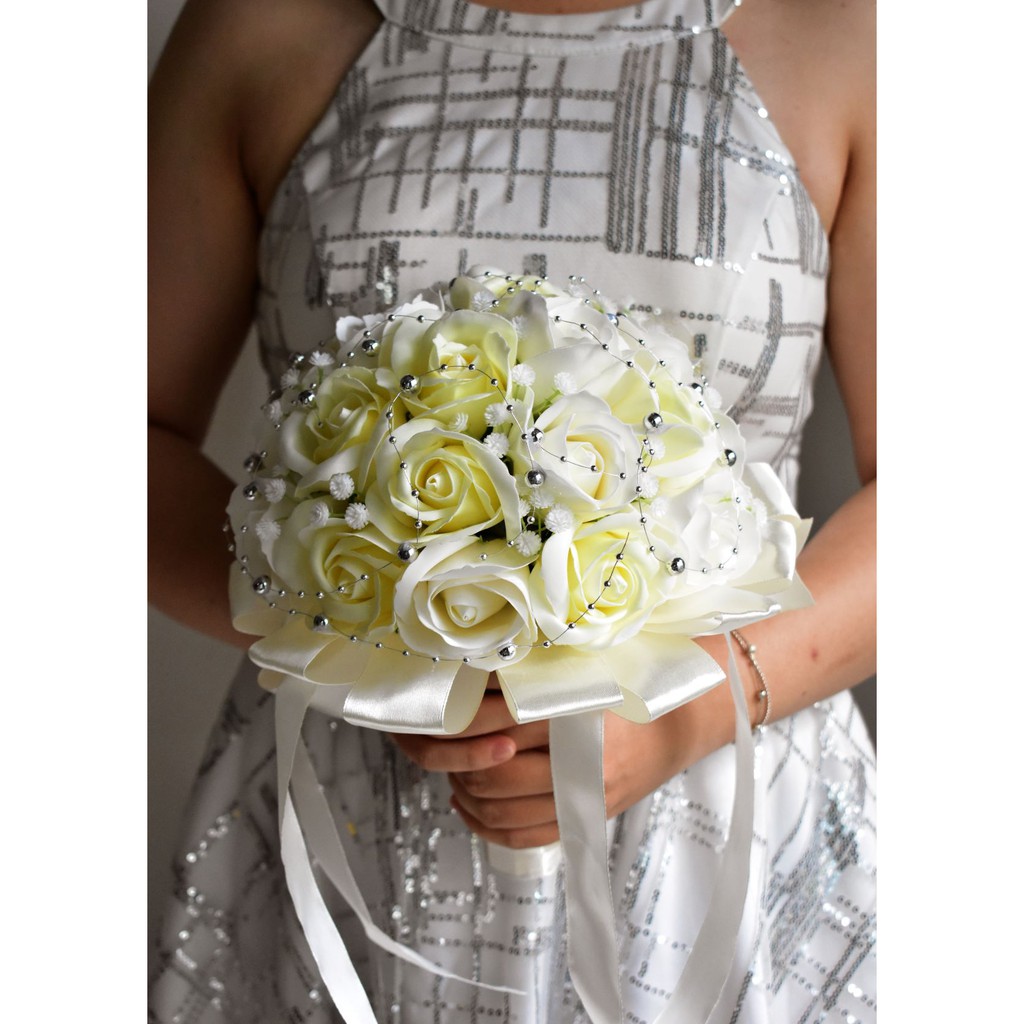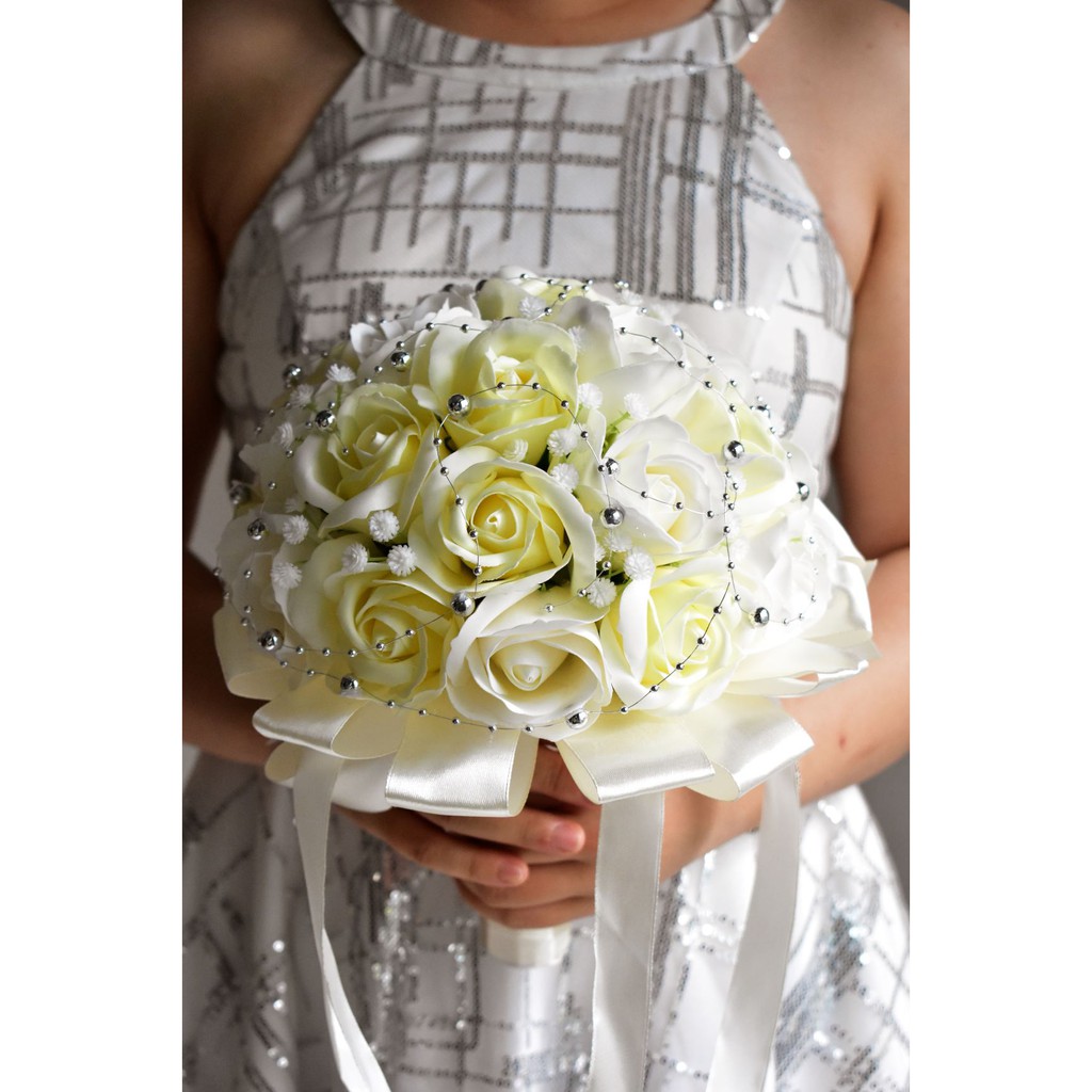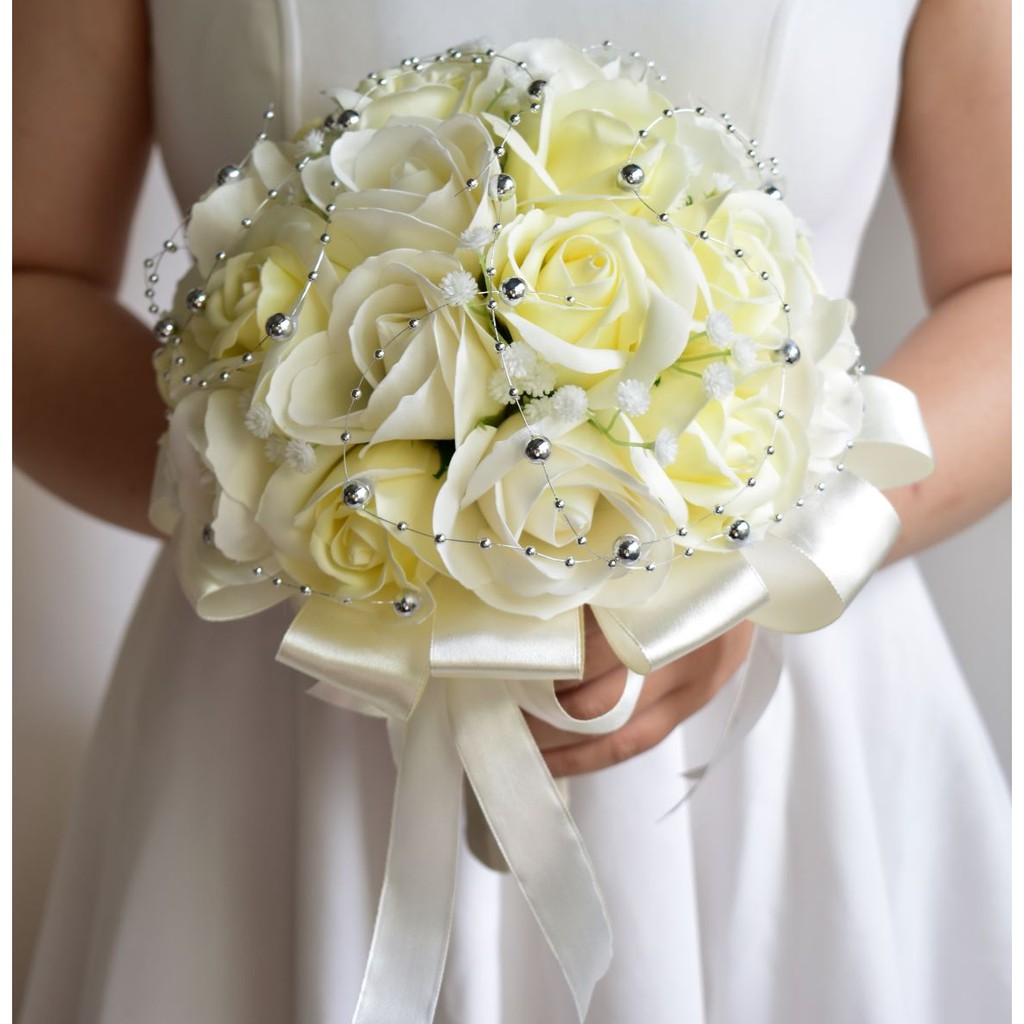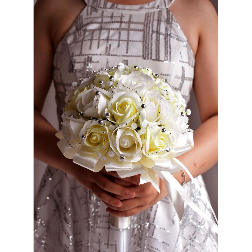 Nhà cửa & Đời sống > Trang trí nhà cửa > Hoa trang trí || Bó hoa cưới cầm tay cô dâu hoa hồng sáp trắng đính dây châu ánh bạc. Tặng kèm hoa cài áo chú rễCòn hàng