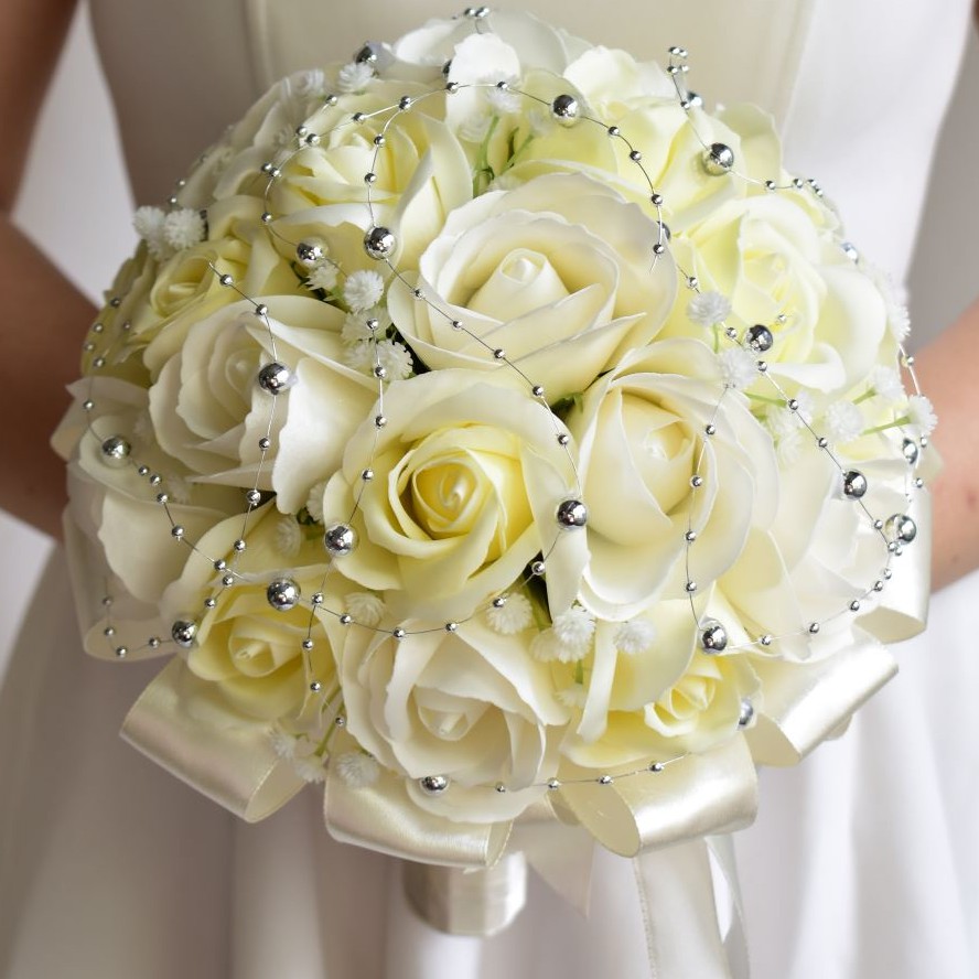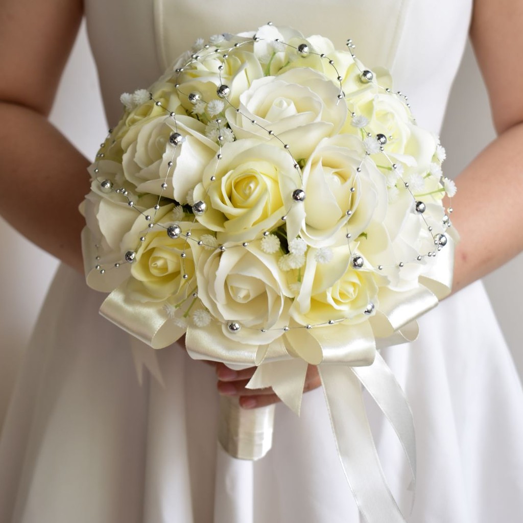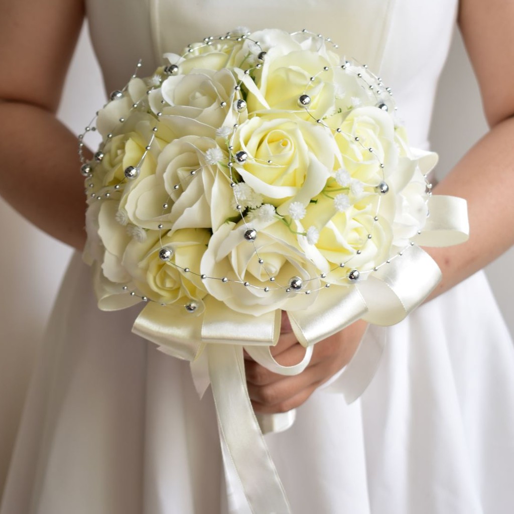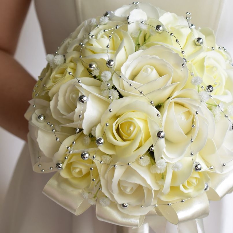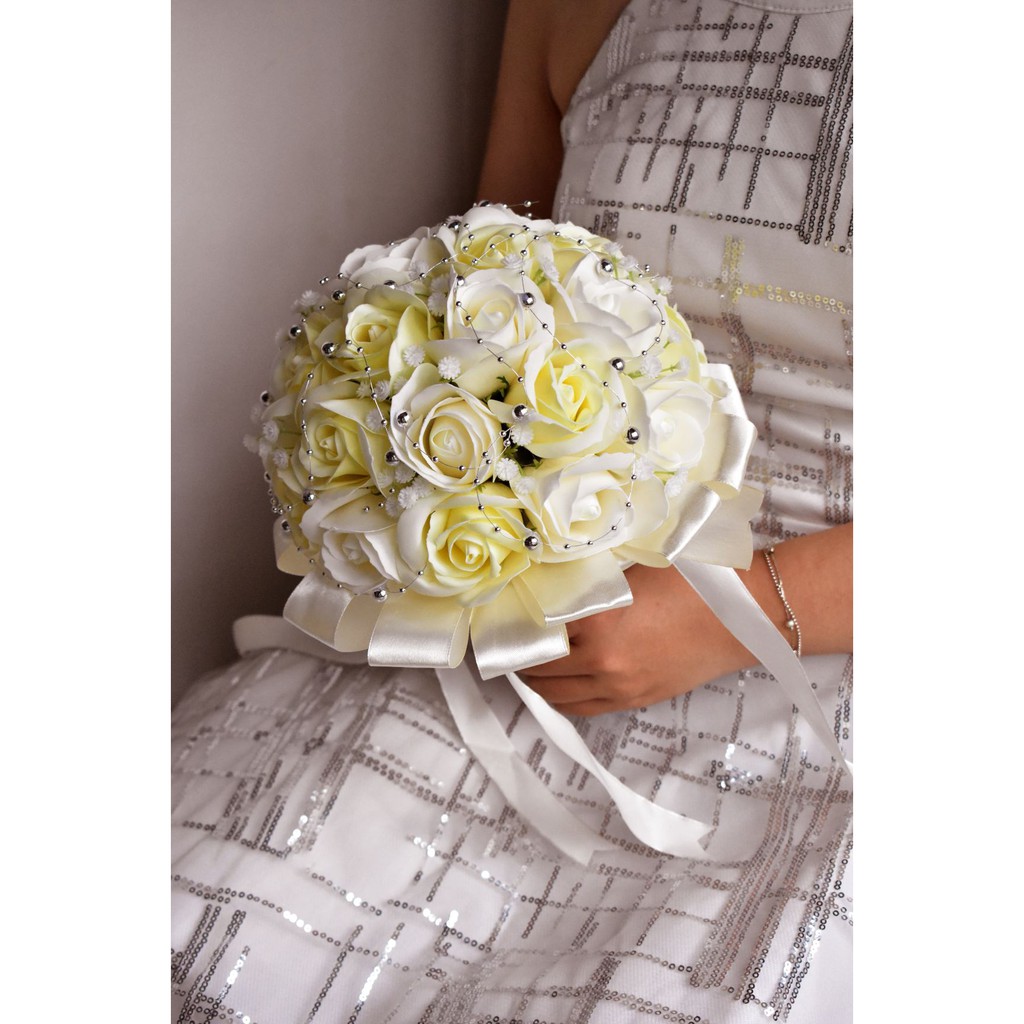 Nhà cửa & Đời sống > Trang trí nhà cửa > Hoa trang trí || Bó hoa cưới cầm tay cô dâu hoa hồng sáp trắng đính dây châu ánh bạc. Tặng kèm hoa cài áo chú rễCòn hàng
