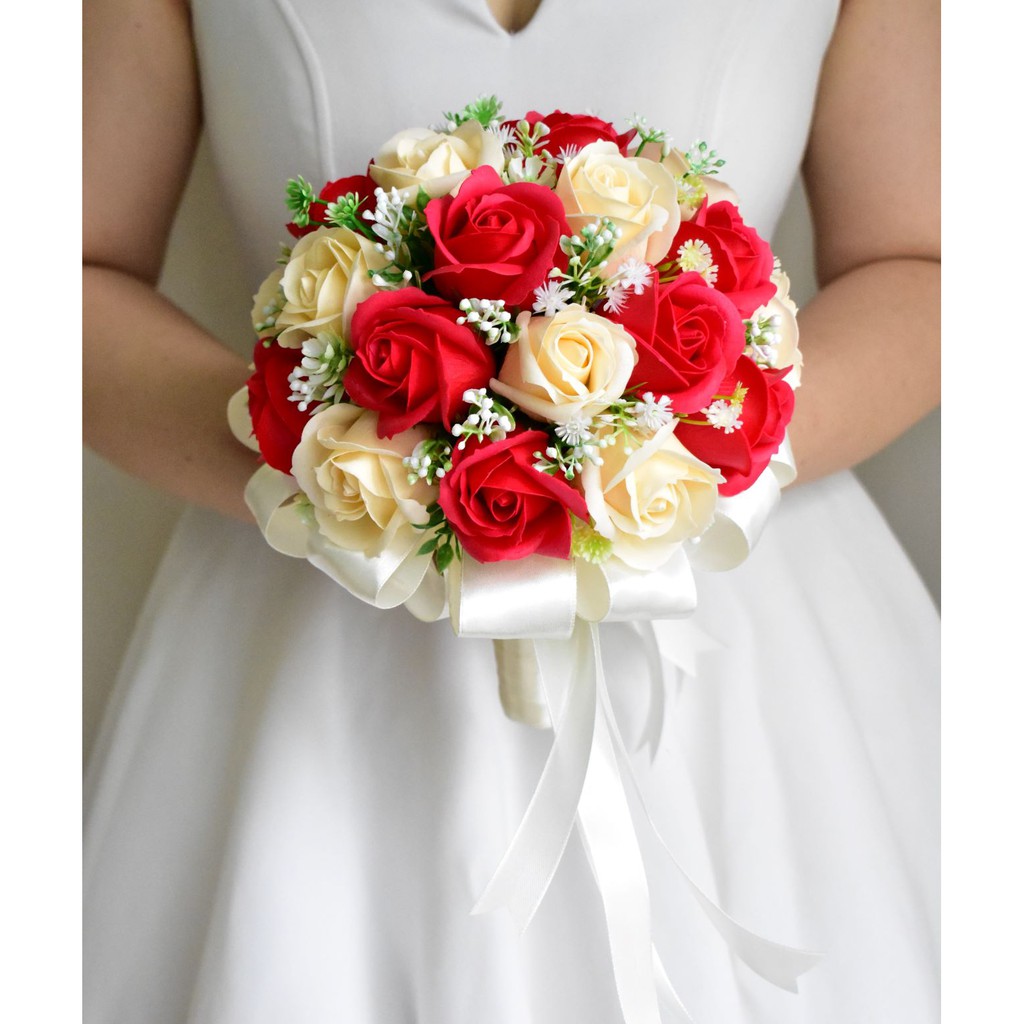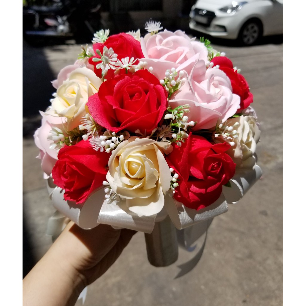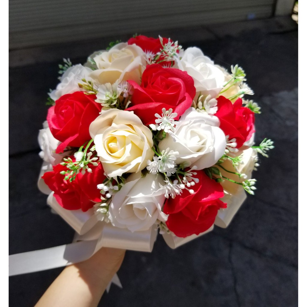 Bó hoa cưới bằng hoa hồng sáp thơm, khoảng từ 21 đến 24 bông, đường kính 21cm