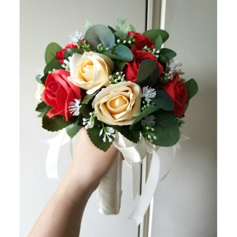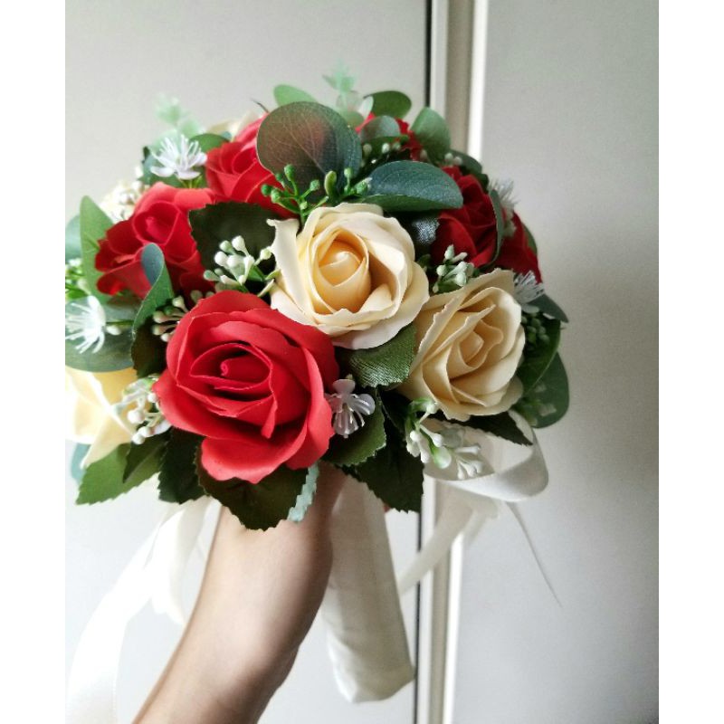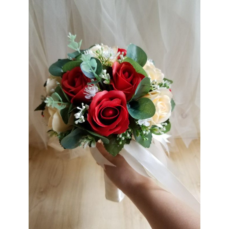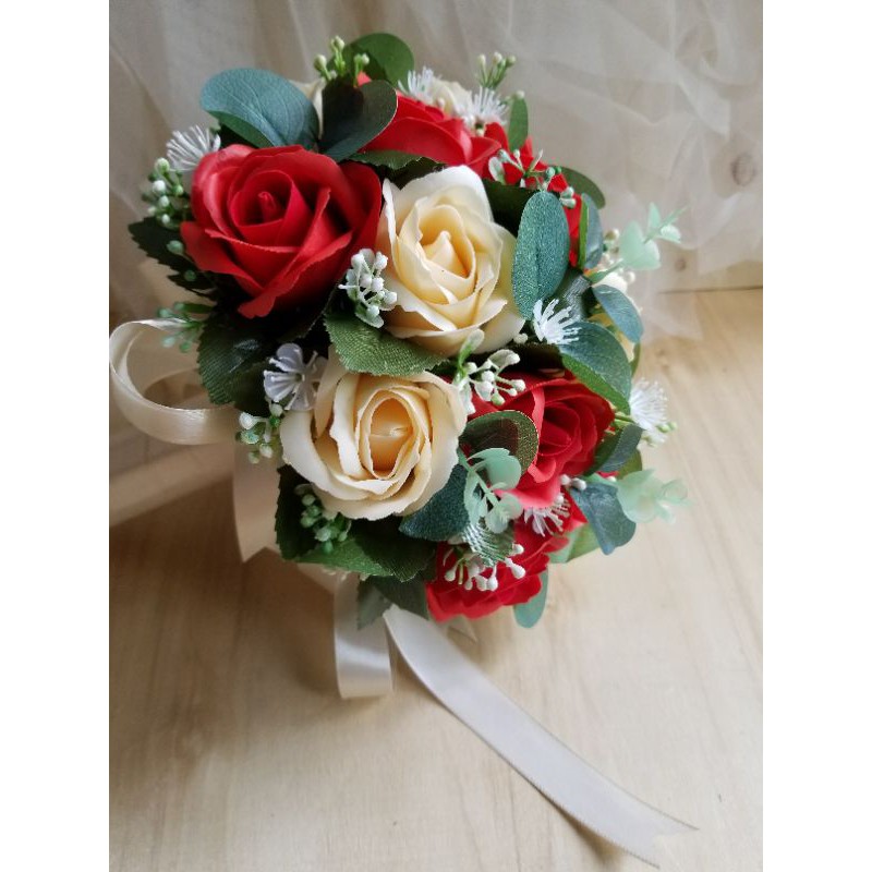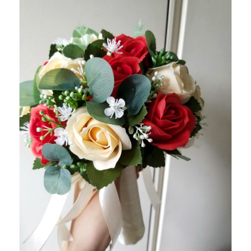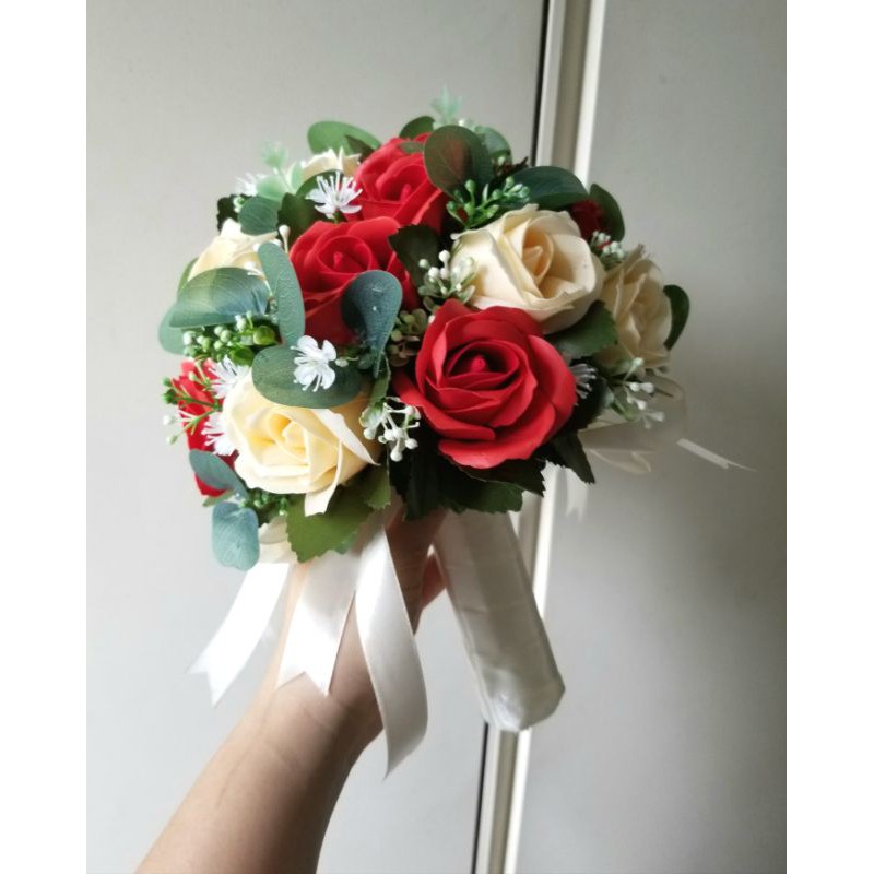 TẶNG KÈM HOA CÀI ÁO CHÚ RỄBÓ HOA CƯỚI CẦM TAY CÔ DÂU HOA HỒNG SÁP MÀU KEM CAM PASTEL VÀ ĐỎ ĐIỂM LÁ XANH VINTAGE