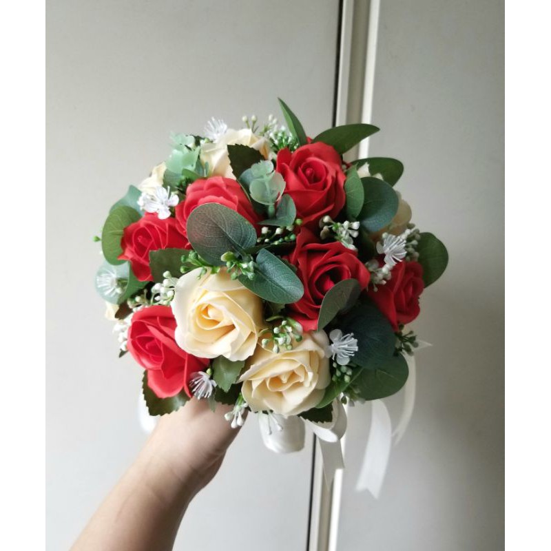 Bó hoa cưới bằng hoa hồng sáp thơm, khoảng 18 đến 22 bông, đường kính 21cm