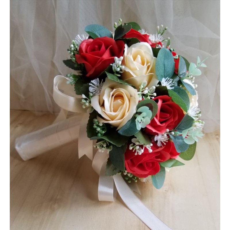 Nhà cửa & Đời sống > Trang trí nhà cửa > Hoa trang trí || BÓ HOA CƯỚI CẦM TAY CÔ DÂU HOA HỒNG SÁP MÀU KEM CAM PASTEL VÀ ĐỎ ĐIỂM LÁ XANH VINTAGECòn hàng