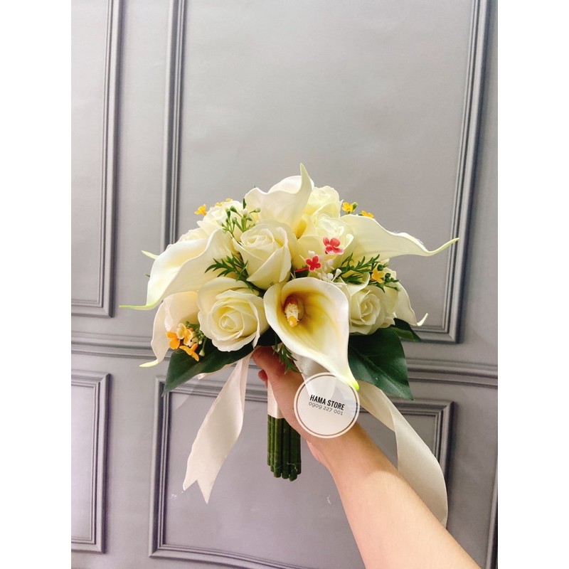 Bó hoa cưới cầm tay cô dâu sáp thơm và hoa rum hoa Calla Lily điểm baby màu xinh xắn