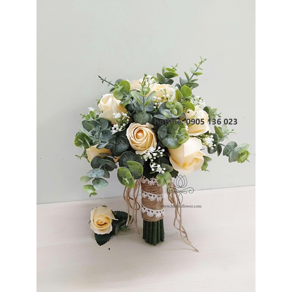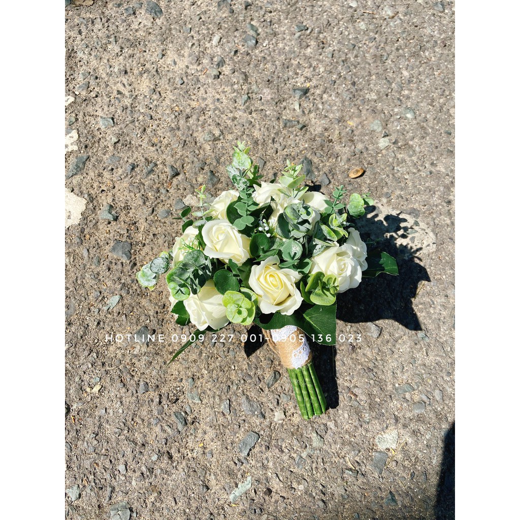 Bó hoa cưới sáp thơm bảo quản tránh nước và giữ lại mãi mãi, tặng kèm cài áo chú rể.