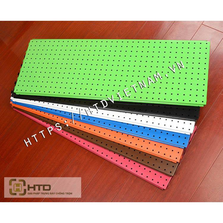 - Được gép lại bởi 5 tấm thép đục lỗ ( 88*30cm ) trên hai thanh ray (150cm), trên tấm thép có các răng cưa để cài chốt vào thanh ray. Tấm thép đục lỗ có nhiều màu sắc khác nhau kho khách hàng lựa chọn.