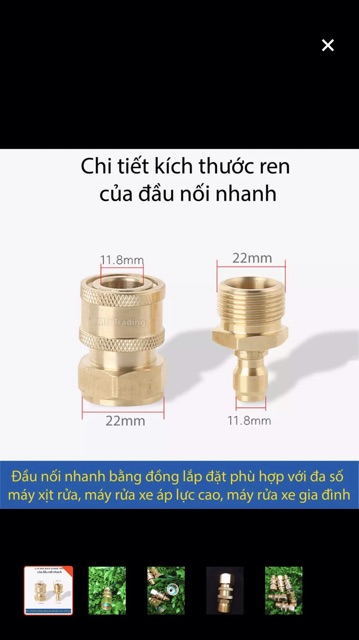 + bộ khớp nối nhanh cho dây rửa xe gồm có :- 1 đầu ren trong 22mm bạn có thể lắp vao ngõ nước xịt ra áp lực .