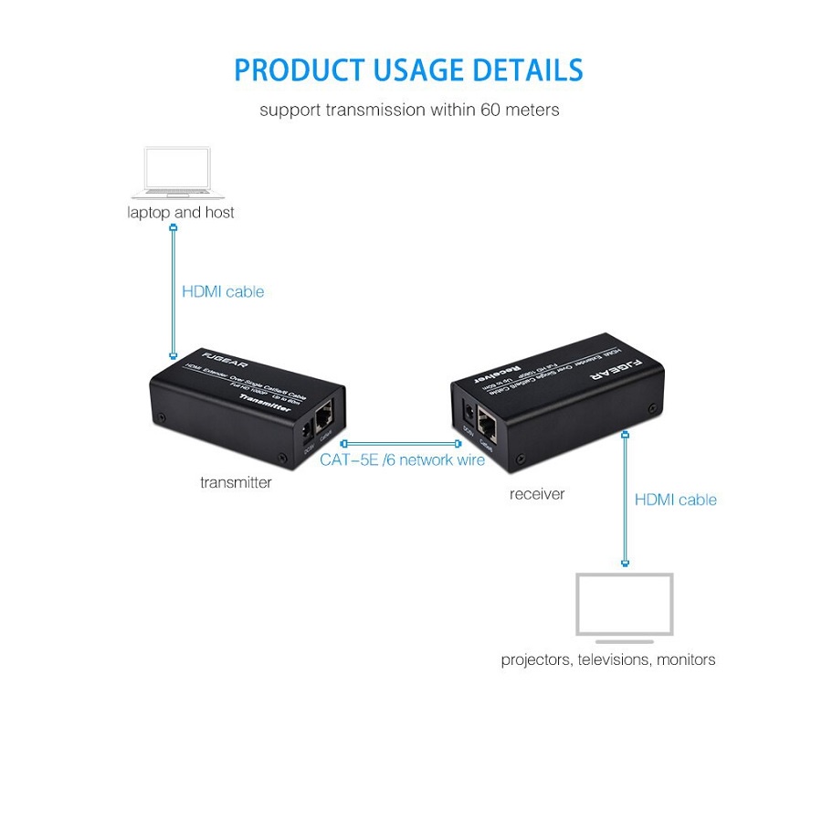 - Bộ kích tín hiệu HDMI qua dây mạng dài 60m sử dụng cáp mạng cat 5, cat6 lên đến 60 mét thay vì cáp HDMI để truyền tín hiệu độ nét cao, giúp cắt giảm đáng kể chi phí.