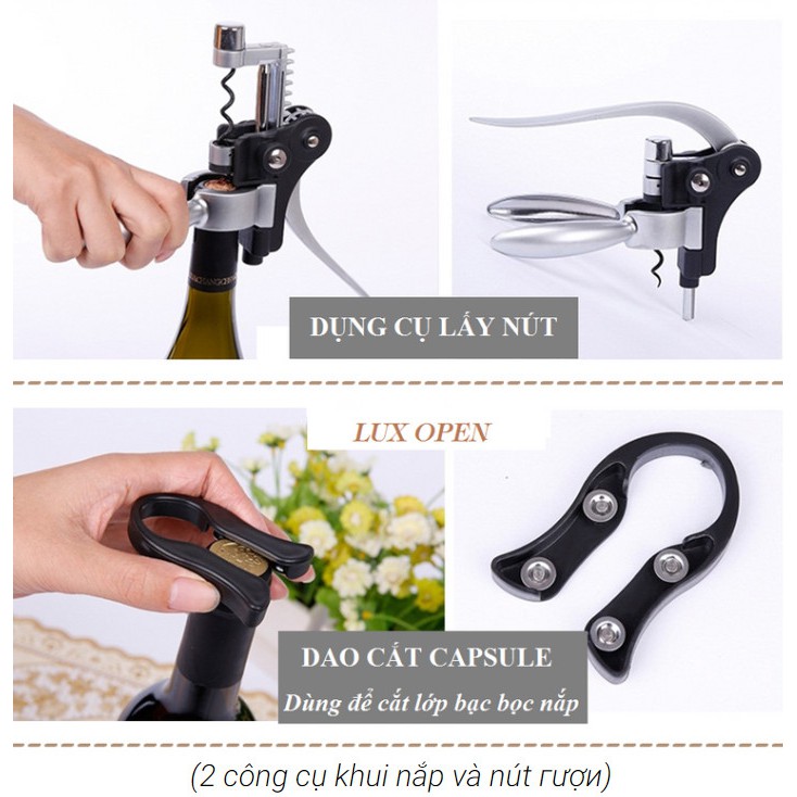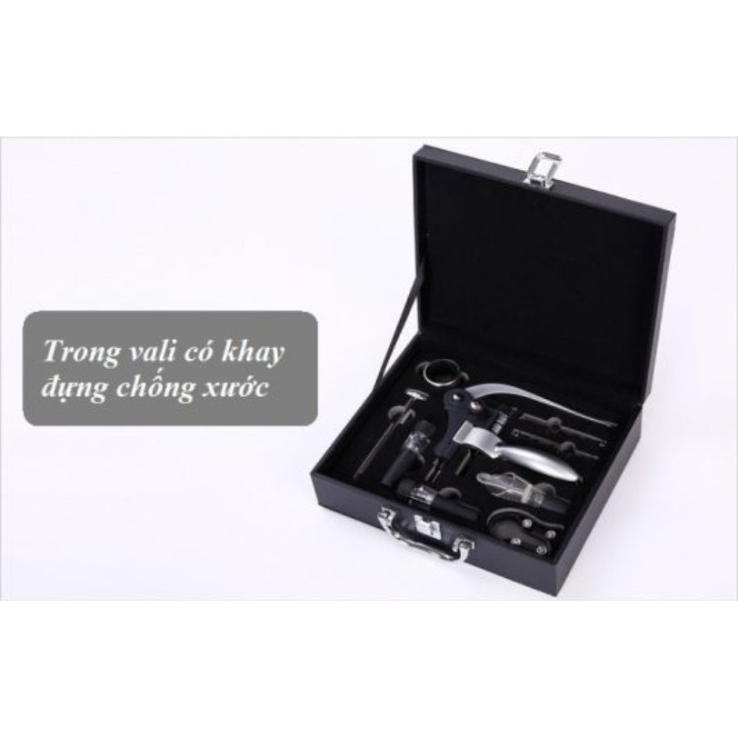 Bộ khui Lux open mở vang chuyên nghiệp gồm vali da và 9 phụ kiện:- 01 dụng cụ mở nút chuyên nghiệp