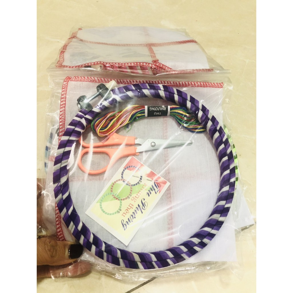 - Đủ bộ gồm kim, chỉ, kéo, vải, khung.
