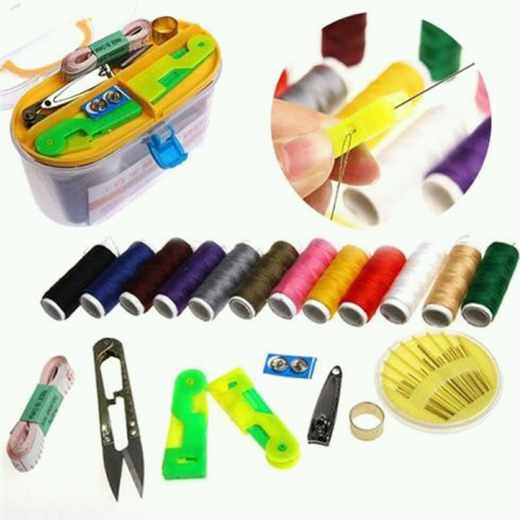 – Bộ sản phẩm bao gồm: 12 cuộn chỉ các màu, 01 hộp kim các loại (25 chiếc) , 01 kéo cắt chỉ, 01 thước dây, 01 dụng cụ xỏ chỉ, 10 kim băng, 02 cúc bấm, 01 bấm móng tay, 01 dụng cụ lấy ráy tai, 01 nhẫn ấn kim.