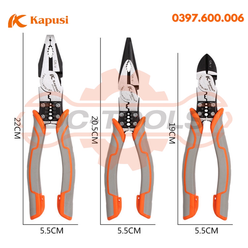 BỘ KÌM KAPUSI KÌM CẮT, KÌM ĐIỆN, KÌM NHỌN 8,5 ICNH 210mm ĐA NĂNG chính hãng KAPUSI JAPAN, thép CR-V cao cấp DC-TOOL