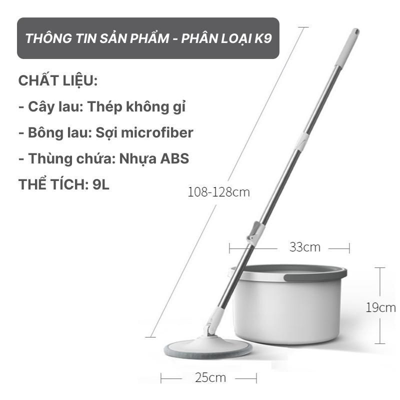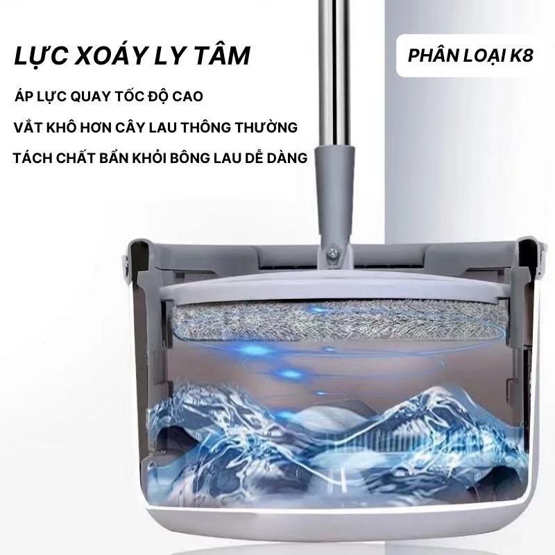 - Cây lau nhà-có thiết kế mới thông minh tiện lợi thùng vắt xoay tròn gồm 1 khe để giặt cây lau và 1 khe để vắt cây lau rất sạch sẽ và tiện lợi. Có thể vắt giẻ lau khô đến 95%, thùng vắt còn thiết kế thêm rang lược để chải sạch bụi bẩn và lông tóc, có lỗ thoát nước thông minh và quai xách tiện lợi giúp cầm xách di chuyển linh hoạt.
