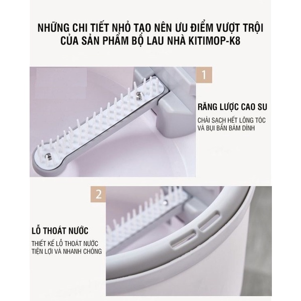– Cây lau nhà K8 có thiết kế mới thông minh tiện lợi thùng vắt xoay tròn gồm: 1 khe để giặt và 1 khe để vắt rất sạch sẽ và tiện lợi. Có thể vắt khô đến 95%, CÓ RĂNG LƯỢC ĐỂ CHẢI SẠCH BỤI BẨN VÀ LÔNG , có lỗ thoát nước thông minh và quai xách tiện lợi giúp cầm xách di chuyển linh hoạt.
