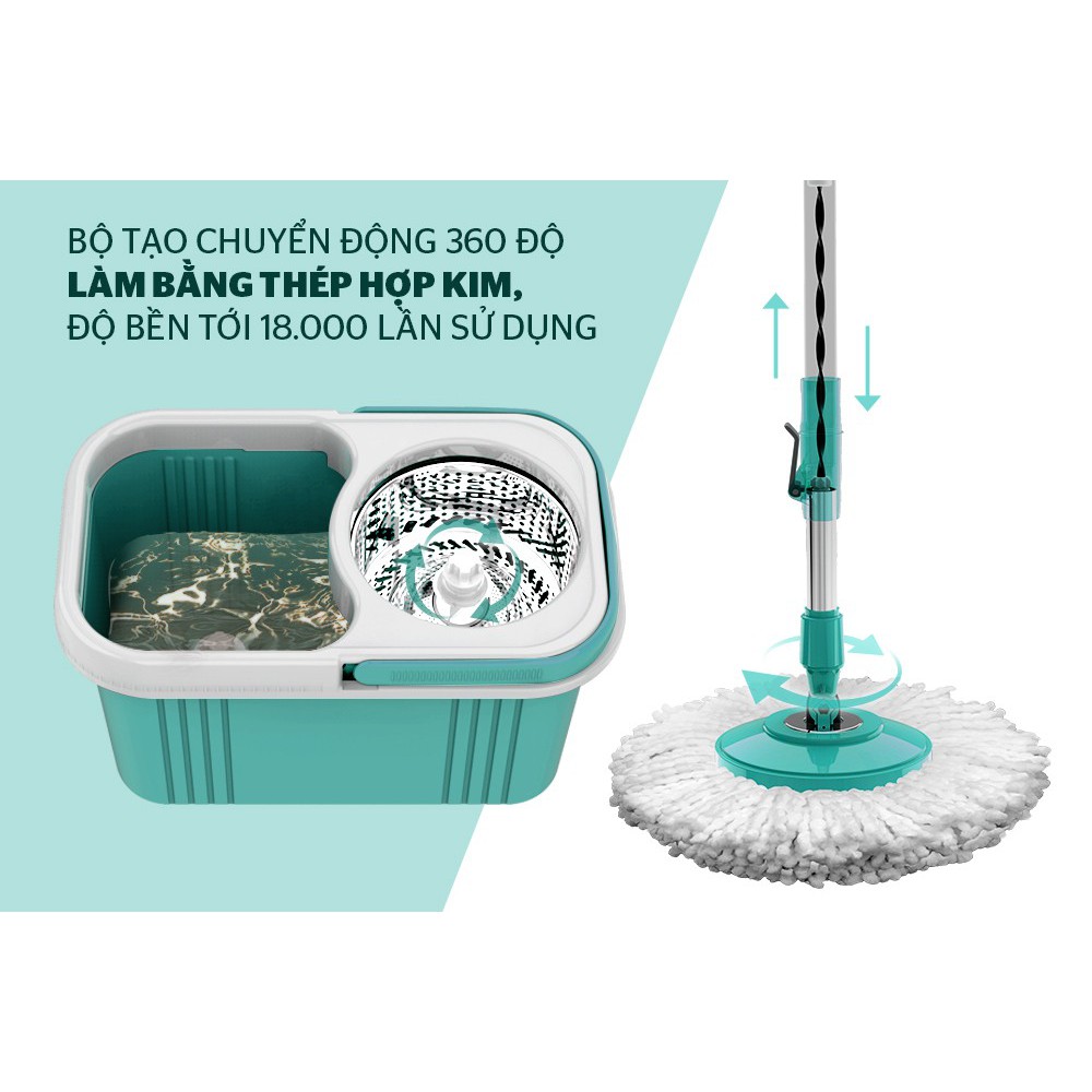 Bộ phận tạo chuyển động với thanh dẫn động xoắn bằng thép hợp kim và cơ cấu tạo chuyển động bằng nhựa POM chống mài mòn tốt cùng hệ thống giảm chấn động bằng cao su giúp tạo chuyển động 360 độ nhẹ nhàng, tăng độ bền sản phẩm (thao tác vắt 18.000 lần). Chỉ cần nhấn cây lau vào thùng giặt hoặc lồng vắt bạn sẽ dễ dàng giặt hoặc vắt khô bông lau.