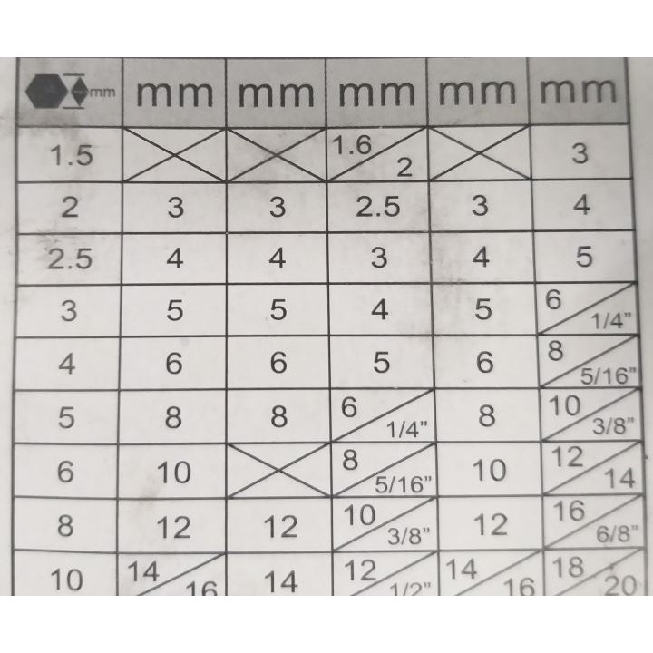 Kích thước: 1,5mm, 2mm, 2,5mm, 3mm, 4mm, 5mm, 6mm, 8mm, 10mm
