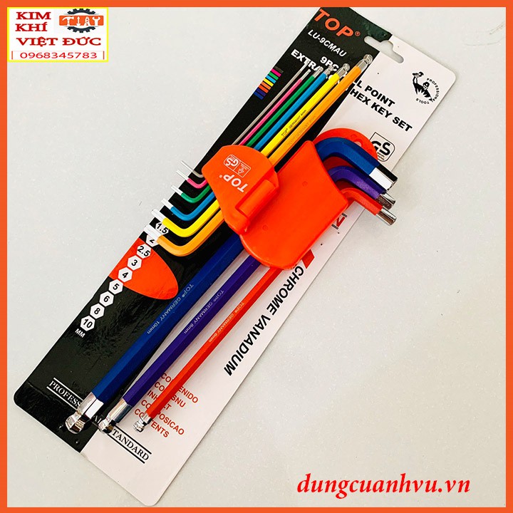 Bộ lục giác TOP hình dạng chữ L với 1 đầu bi tiện dụng sản xuất từ thép cứng chống gỉ phủ xi 7 màu cao cấp rất đẹp cỡ 1.5, 2, 2.5, 3, 4, 5, 6, 8, 10 mm.