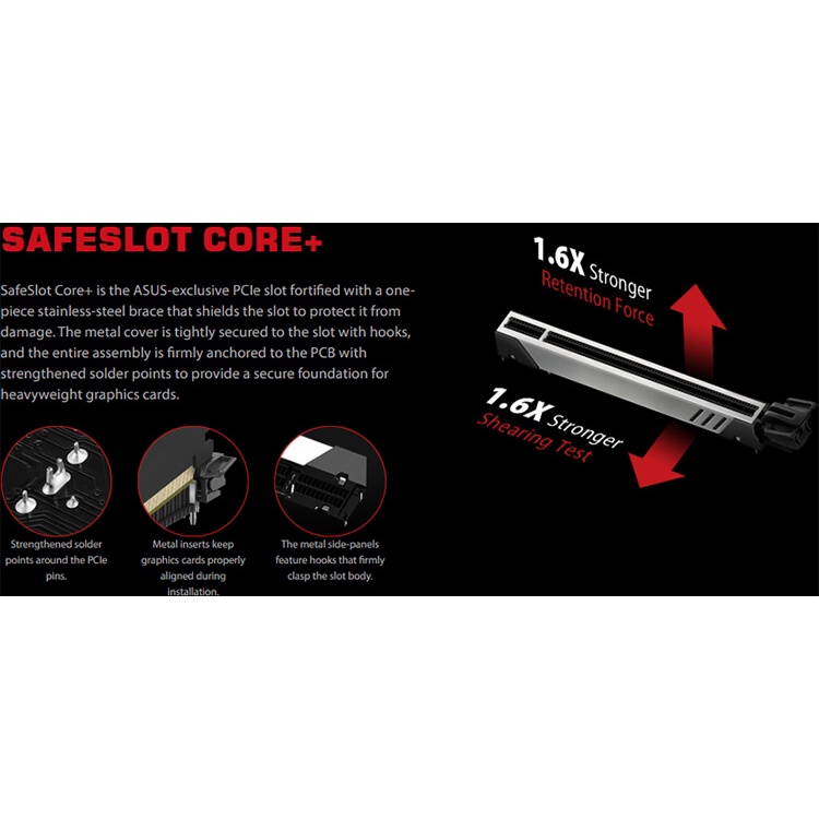 SafeSlot Core + là khe cắm PCIe độc quyền của ASUS được củng cố bằng nẹp thép không gỉ một mảnh che chắn khe cắm để bảo vệ nó khỏi bị hư hại.