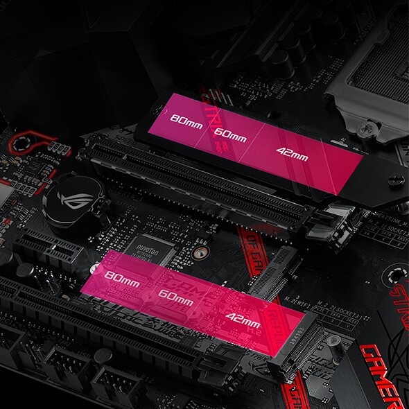 Có sẵn hai khe cắm M.2, với một khe cắm hỗ trợ cả hai chế độ SATA và PCI Express® 3.0 x4 và khe cắm PCIe 3.0 x4 khác hỗ trợ cho NVMe. Cùng nhau chúng cung cấp giao diện M.2 nhanh nhất và linh hoạt nhất hiện có. Có sẵn hai khe cắm M.2