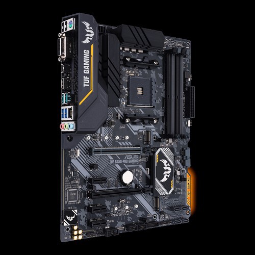 -Mainboard ASUS TUF B450-PRO GAMING dành cho đối tượng thuộc tầm trung với những nhu cầu thiết yếu về hiệu năng và độ ổn định. Bo mạch chủ thuộc form mATX nhỏ gọn nhưng vẫn rất ngầu. Thiết kế cứng cáp, đơn giản nam tính. Điểm nổi bất nhất vẫn là logo TUF Gaming ở góc dưới bên phải, tuy nhỏ nhưng vẫn được trang bị hiệu ứng đèn led RGB màu mè và tương thích luôn với phần mềm Asus Aura.