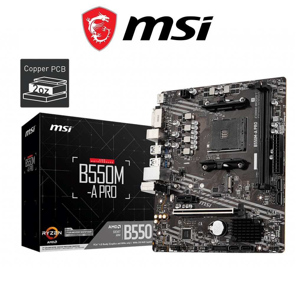 Đánh giá sản phẩm Mainboard MSI B550-A PRO (AMD B550, Socket AM4, ATX, 4 khe RAM DRR4)Mainboard MSI B550-A PRO là bo mạch chủ có kích thước ATX, sử dụng chipset tầm trung B550 mới nhất của AMD cho hiệu năng vượt trội so với B450 hay B350 cũ. Mainboard MSI B550-A PRO vẫn sử dụng socket AM4, hỗ trợ các CPU AMD Ryzen 3000 Series trở lên (Trừ Ryzen 5 3500g và Ryzen 3 3200g). Cùng với đó là hàng loạt công nghệ độc quyền của MSI.