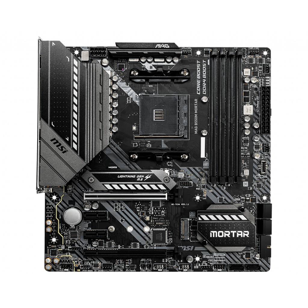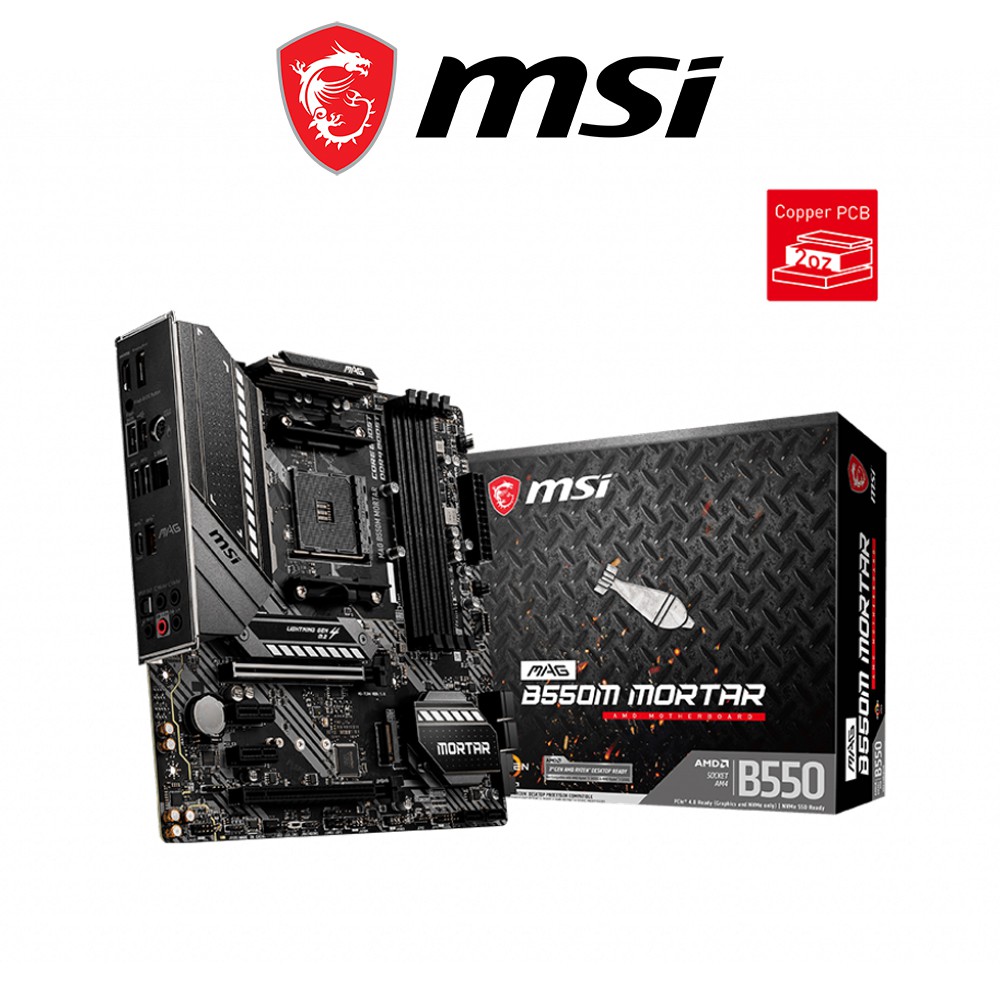 Đánh giá sản phẩm Mainboard MSI MAG B550M MORTAR tản nhiệt tốt, hiệu suất caoMainboard MSI MAG B550M MORTAR là bo mạch chủ có kích thước ATX, sử dụng chipset tầm trung B550 mới nhất của AMD cho hiệu năng vượt trội so với B450 hay B350 cũ. Mainboard MSI MAG B550M MORTAR vẫn sử dụng socket AM4, hỗ trợ các CPU AMD Ryzen 3000 Series trở lên (Trừ Ryzen 5 3500g và Ryzen 3 3200g). Cùng với đó là hàng loạt công nghệ độc quyền của MSI.