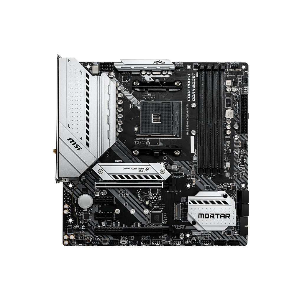 Đánh giá sản phẩm Mainboard MSI MAG B550M MORTAR WIFI hiệu suất tối đa với Wifi tích hợpMainboard MSI MAG B550M MORTAR WIFI là bo mạch chủ có kích thước ATX, sử dụng chipset tầm trung B550 mới nhất của AMD cho hiệu năng vượt trội so với B450 hay B350 cũ. Mainboard MSI MAG B550M MORTAR WIFI vẫn sử dụng socket AM4, hỗ trợ các CPU AMD Ryzen 3000 Series trở lên (Trừ Ryzen 5 3500g và Ryzen 3 3200g). Cùng với đó là hàng loạt công nghệ độc quyền của MSI.