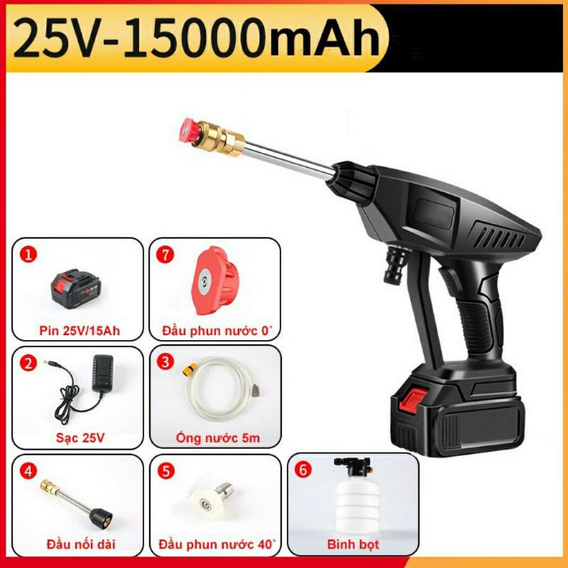 - Sản phẩm bao gồm: Thân máy + Pin lithium 25V/15000mAh + bộ sạc + bình bọt + thanh nối dài bằng thép không gỉ + đầu nối nhanh + ổ cắm nước 0 độ + ổ cắm nước 40 độ + ống dẫn nước 5 mét