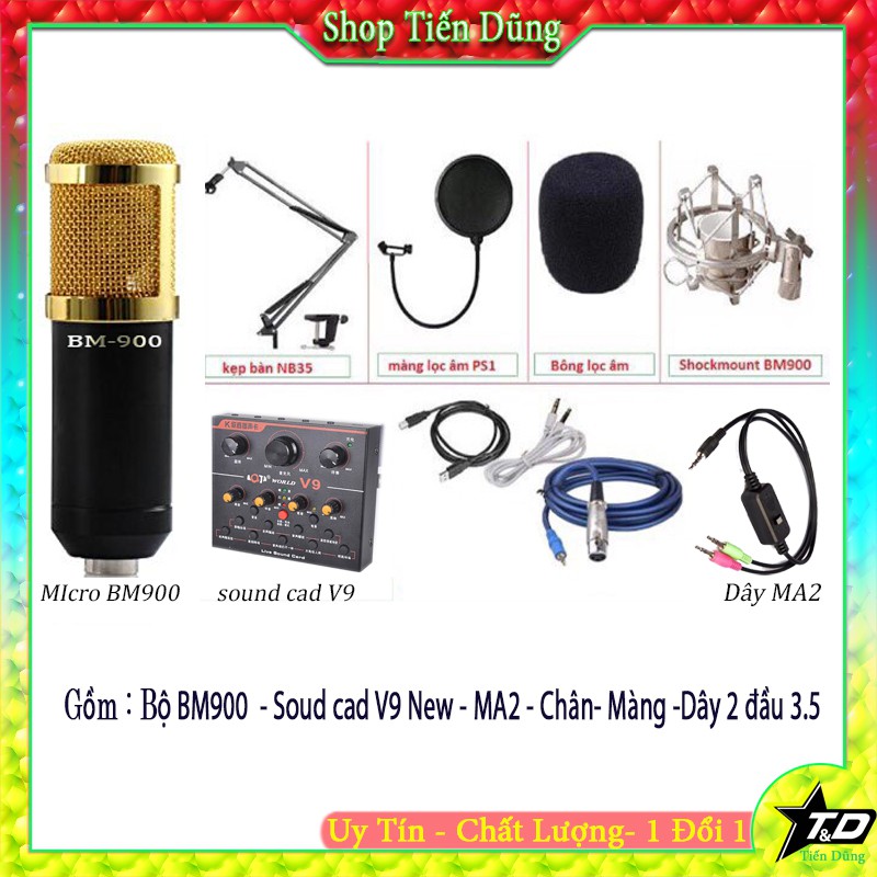 BỘ MIC THU ÂM BM900 ĐI SOUND CARD V9 KÈM DÂY LIVESTREAM MA2 CHÂN MÀNG LỌC ĐỦ BỘ