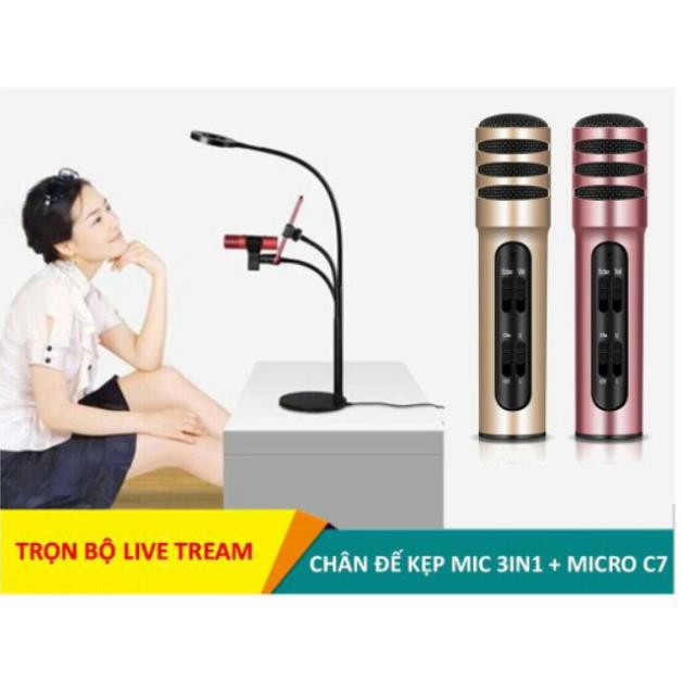 Thiết Bị Âm Thanh > Micro thu âm || Bộ mic thu âm giá rẻ hát karaoke, livestream trên điện thoại ( Chân đế kẹp mic 3in1 có đèn Led + Micro C7)Còn hàng