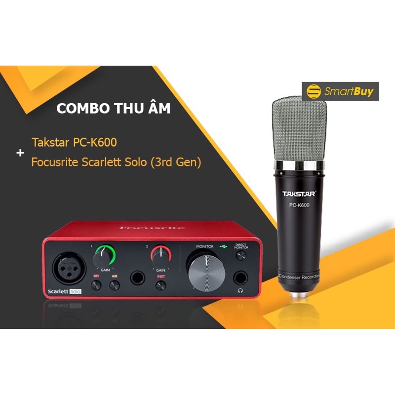 Combo Micro thu âm Takstar PC-K600 và Sound card Focusrite Scarlett Solo (3rd Gen) đươc kết hợp giữa Micro thu âm chất lượng cao và Sound Card chuyên thu âm. Micro TAKSTAR PC K600 là phiên bản mới hơn, vượt bậc hơn đàn anh TAKSTAR K200 đình đám, được cải tiến thêm về khả năng thu âm và chất âm, giúp cho âm thu được dày và ấm hơn so với bản cũ. Sản phẩm đang là lựa chọn hàng đầu cho các phòng thu âm tại nhà, livestream, hát Karaoke cho chất giọng hay hơn. Sound Card thu âm Focusrite Scarlett Solo (3rd Gen) thế hệ thứ 3 cung cấp cho các ca, nhạc sĩ một quá trình thu âm dễ dàng hơn và đặt được chất lượng cao hơn. Được trang bị bộ chuyển đổi AD-DA 24-bit / 192kHz hiệu suất cao, Scarlett đảm bảo chất lượng âm thanh chuyên nghiệp tương tự trong toàn bộ thế hệ thứ ba. Ngoài Micro và Sound Card thu âm còn có sự kết hợp cảu Tai nghe kiểm âm, chân giá micro, màng lọc âm và dây kết nối để tạo lên bộ combo hoàn chỉnh.Giá SOULS