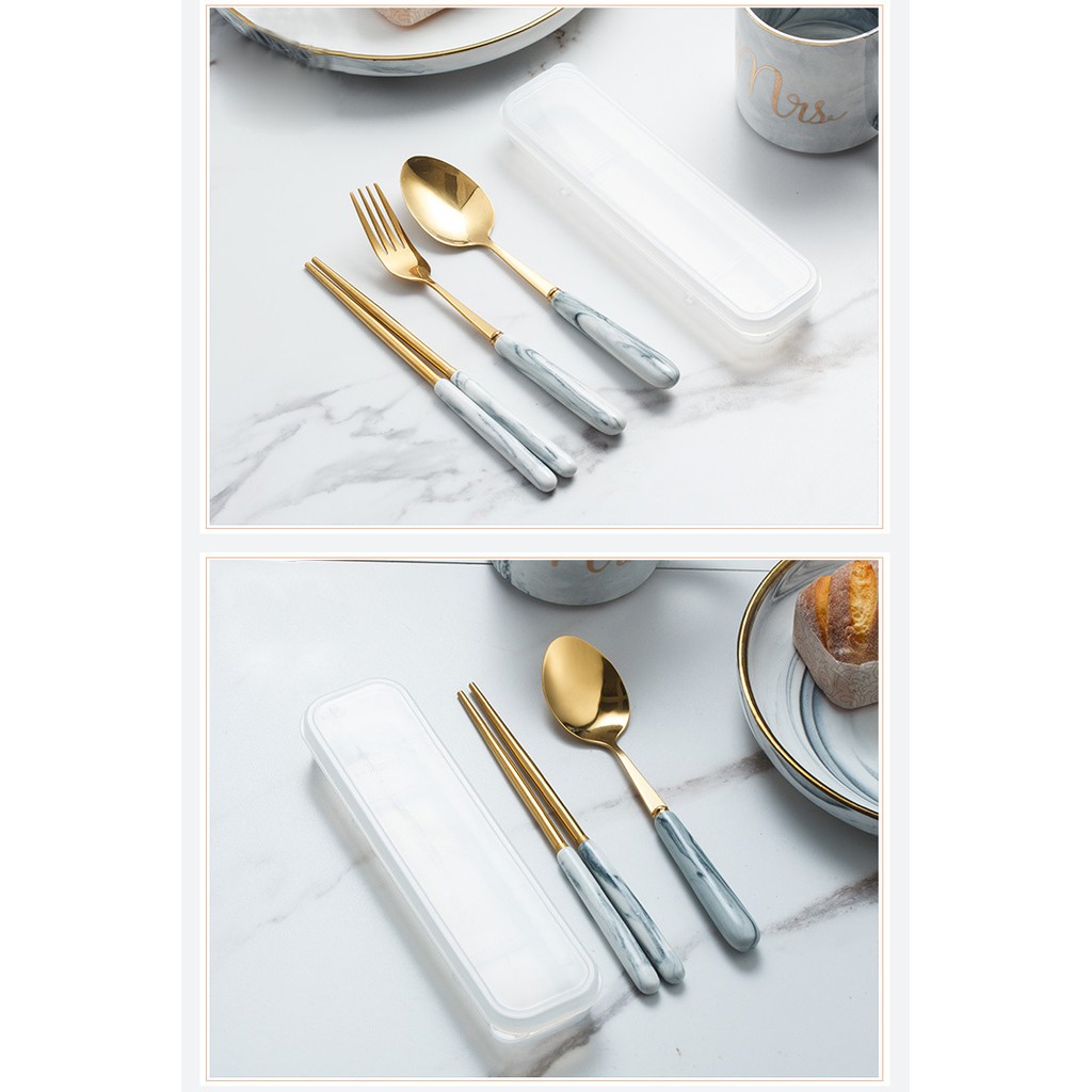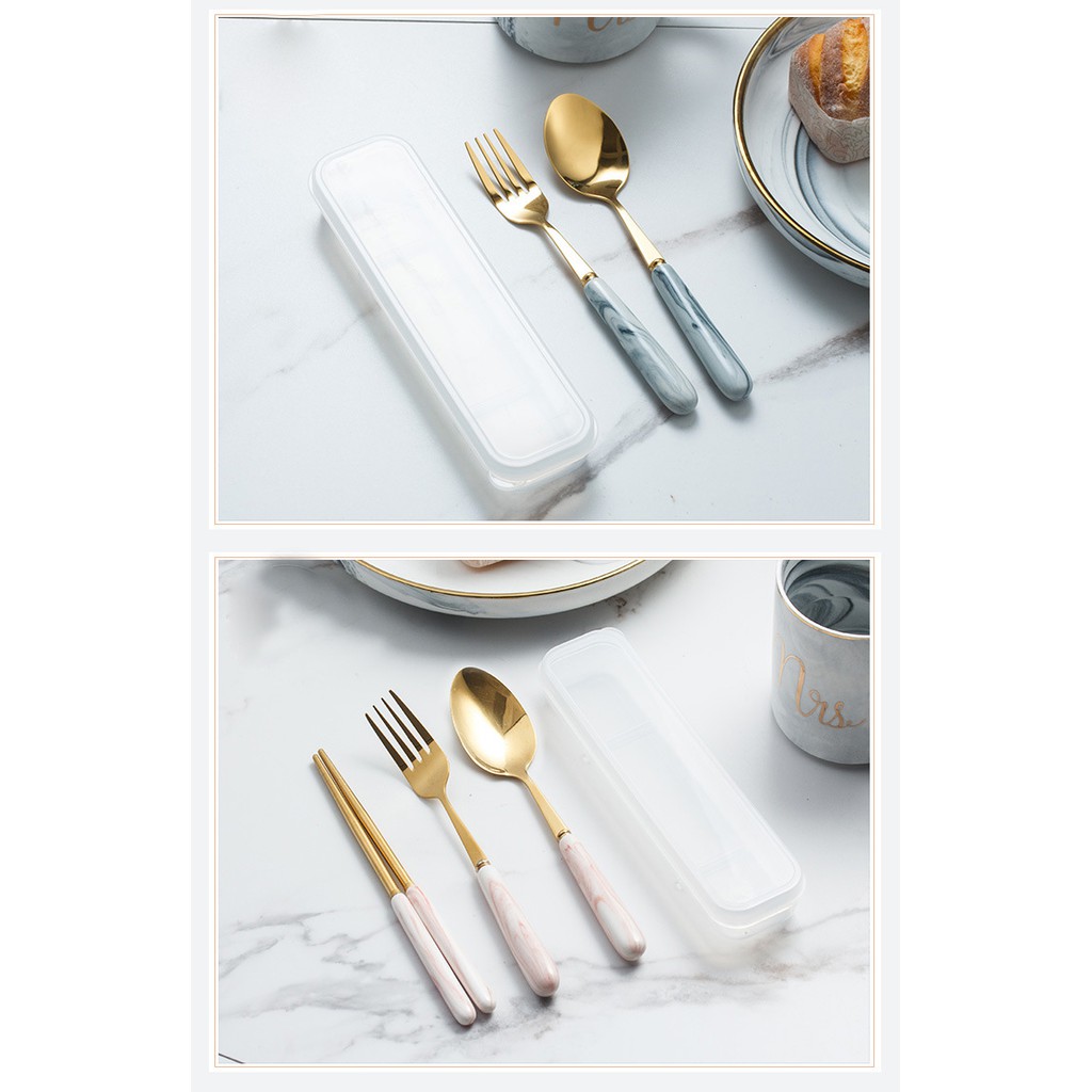 👉Chất liệu: bộ đồ ăn inox bọc đá với hộp đựng bằng nhựa với các chi tiết: