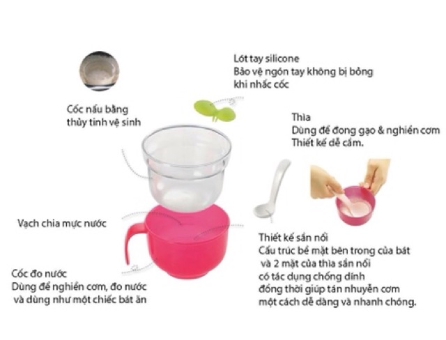 - 1 cốc đựng làm từ nhựa PP không chứa BPA, có tay cầm, có vạch chia ml, dùng để đong nước, đáy cốc có các hạt sần để nghiền cơm nát dễ dàng. Cốc có thể sử dụng như một bát ăn bình thường cho bé.