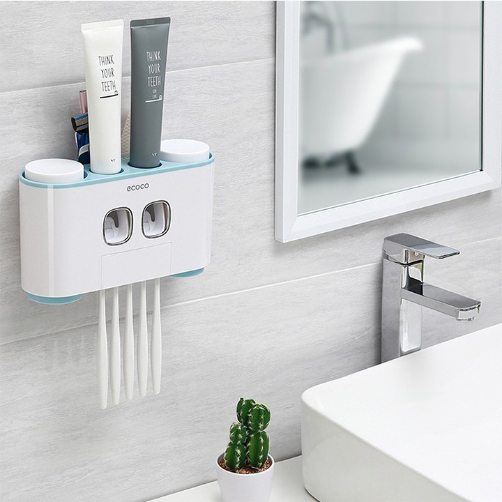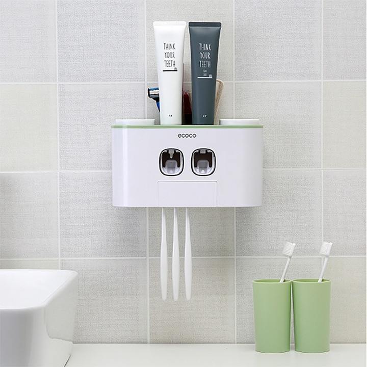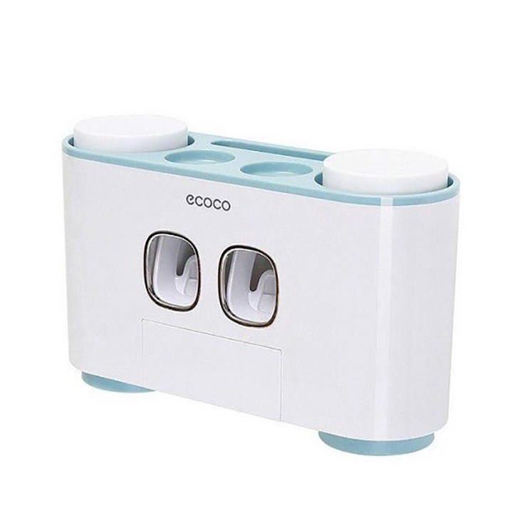 - Bộ nhả kem đánh răng Ecoco bao gồm: + Giá treo 5 bàn chải đánh răng + 2 chỗ chiết kem đánh răng + 4 cốc ( 2 trên 2 dưới ) + 1 khay có thể đựng được lược, cây cạo râu.