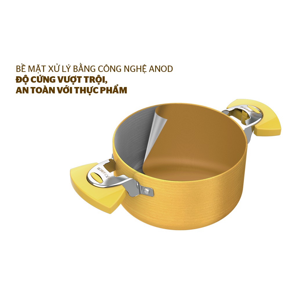 Sản phẩm được làm từ hợp kim nhôm Anod cứng bằng công nghệ tiên tiến giúp sản phẩm có độ cứng và bền vững cao, chống ăn mòn, chịu được nhiệt độ cao. Bên ngoài màu vàng nổi bật, không biến màu theo thời gian.